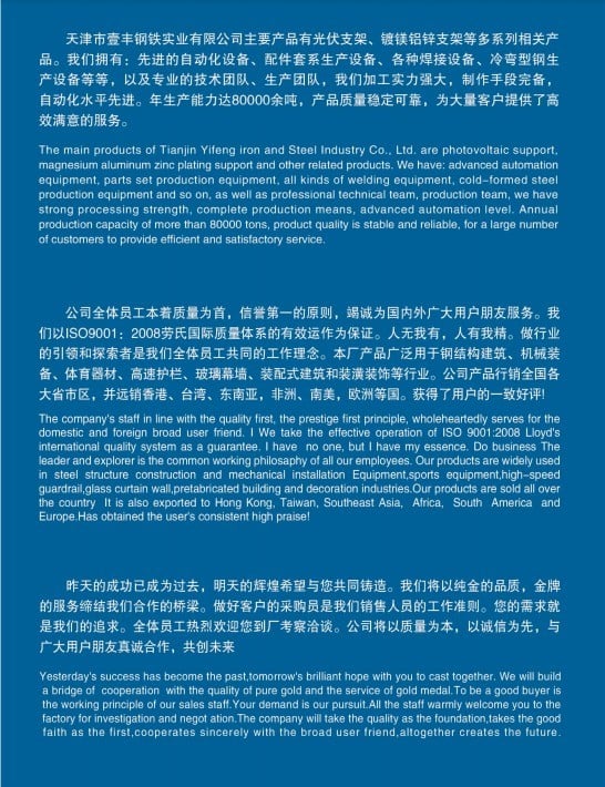 天津市壹丰钢铁实业有限公司主要产品有光伏支架,镀镁铝锌支架等众多系列相关产品。我们拥有:先进的自动化设备,配件套系生产设备,各种焊接设备,冷弯型钢生产设备等等,以及专业的技术团队,生产团队,我们加工实力强大,制作手段完备,自动化水平先进。年生产能力80000余吨,产品质量稳定可靠,为大量用户提供了高效满意的服务。