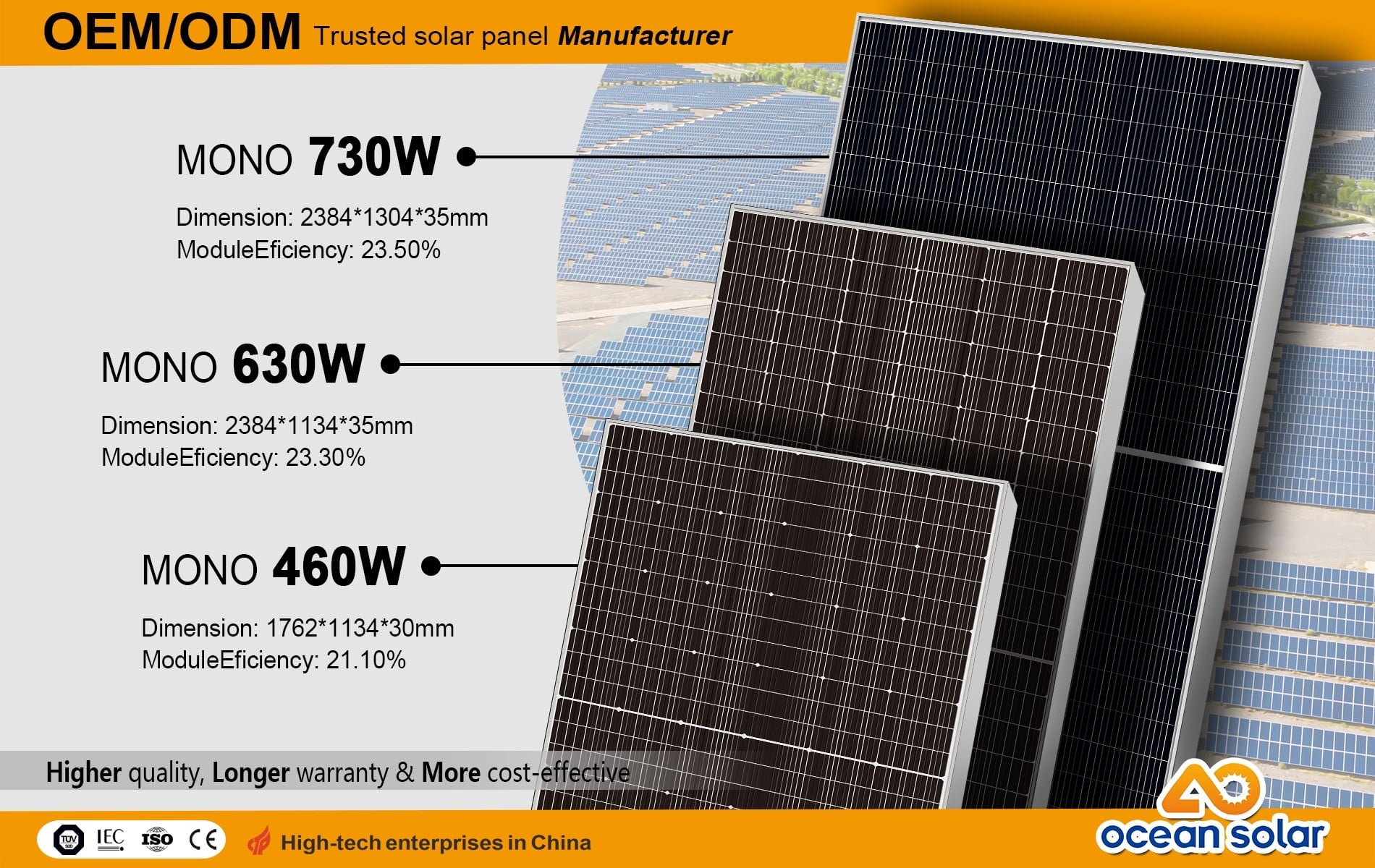 Ocean solar是一家专注于生产高效单晶和多晶太阳能电池组件的高新技术企业,服务于国内外从事离网和并网太阳能系统的安装商、经销商和工厂。 为客户提供高效、安全、可靠、美观且价格有竞争力的太阳能电池板。