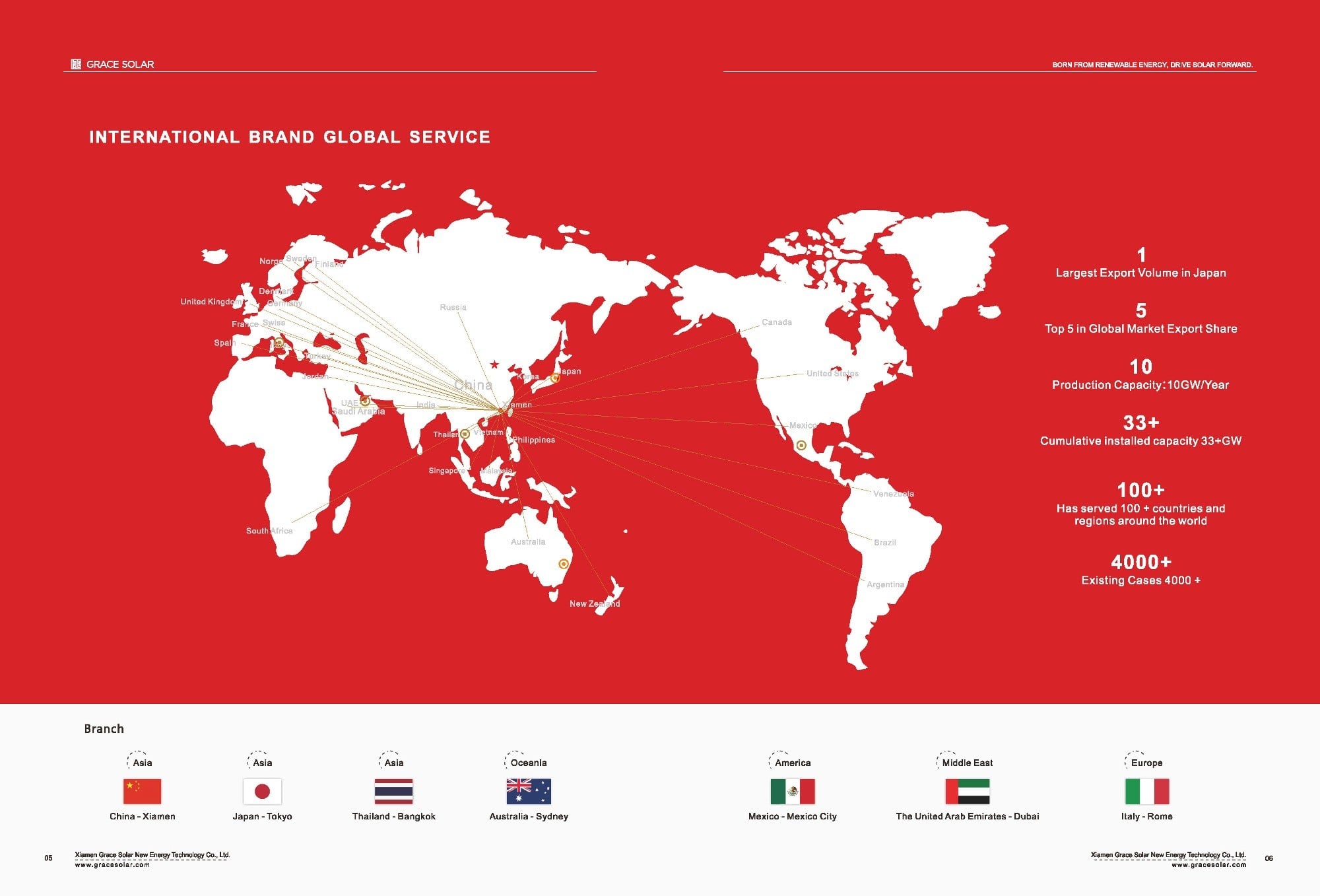 GraceSolar is headquartered in Xiamen, China. We also have overseas branches in Tokyo (Japan), Bangkok (Thailand), Mexico City (Mexico), Dubai (United Arab Emirates), Rome (Italy), and Sydney (Australia).