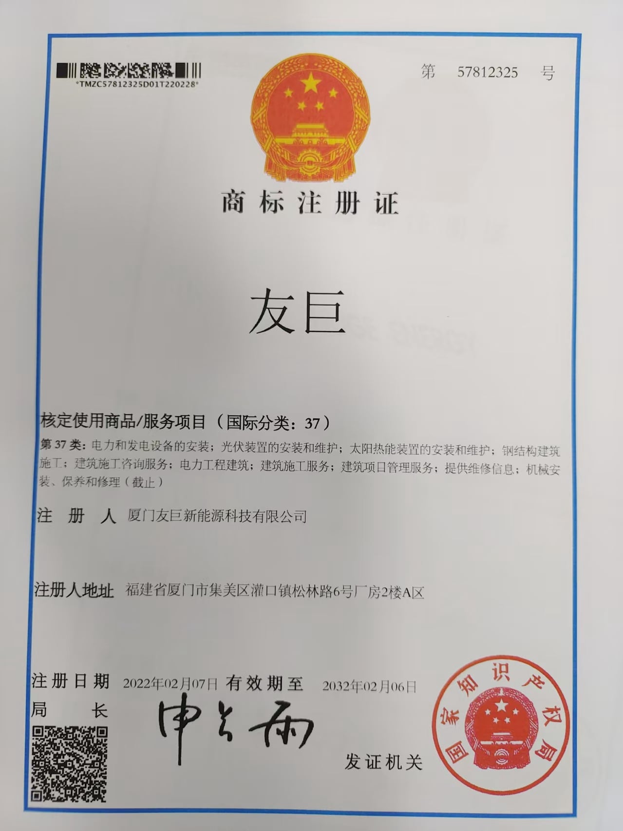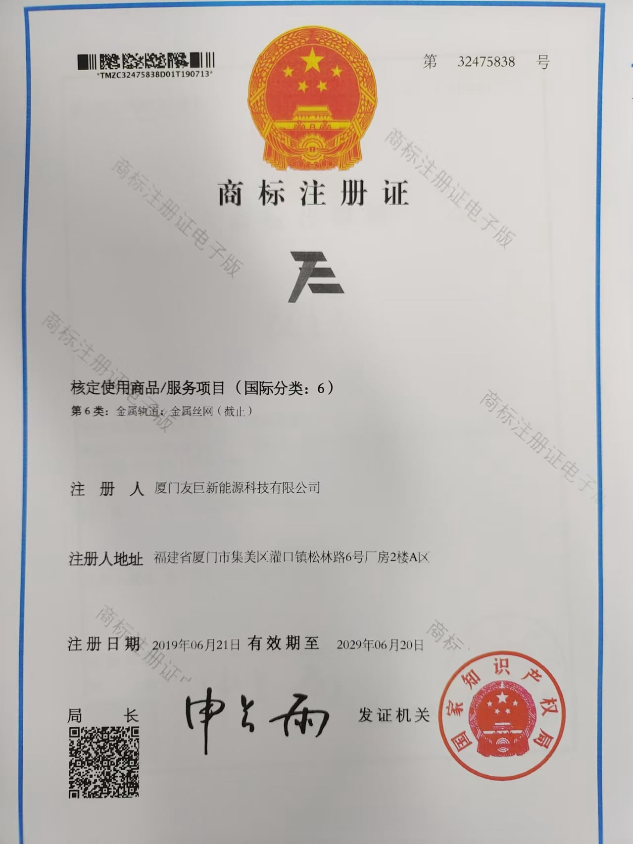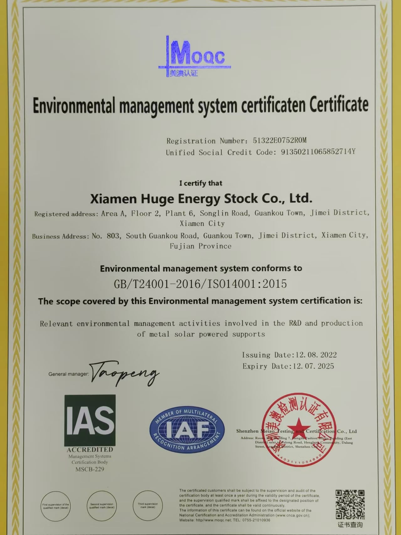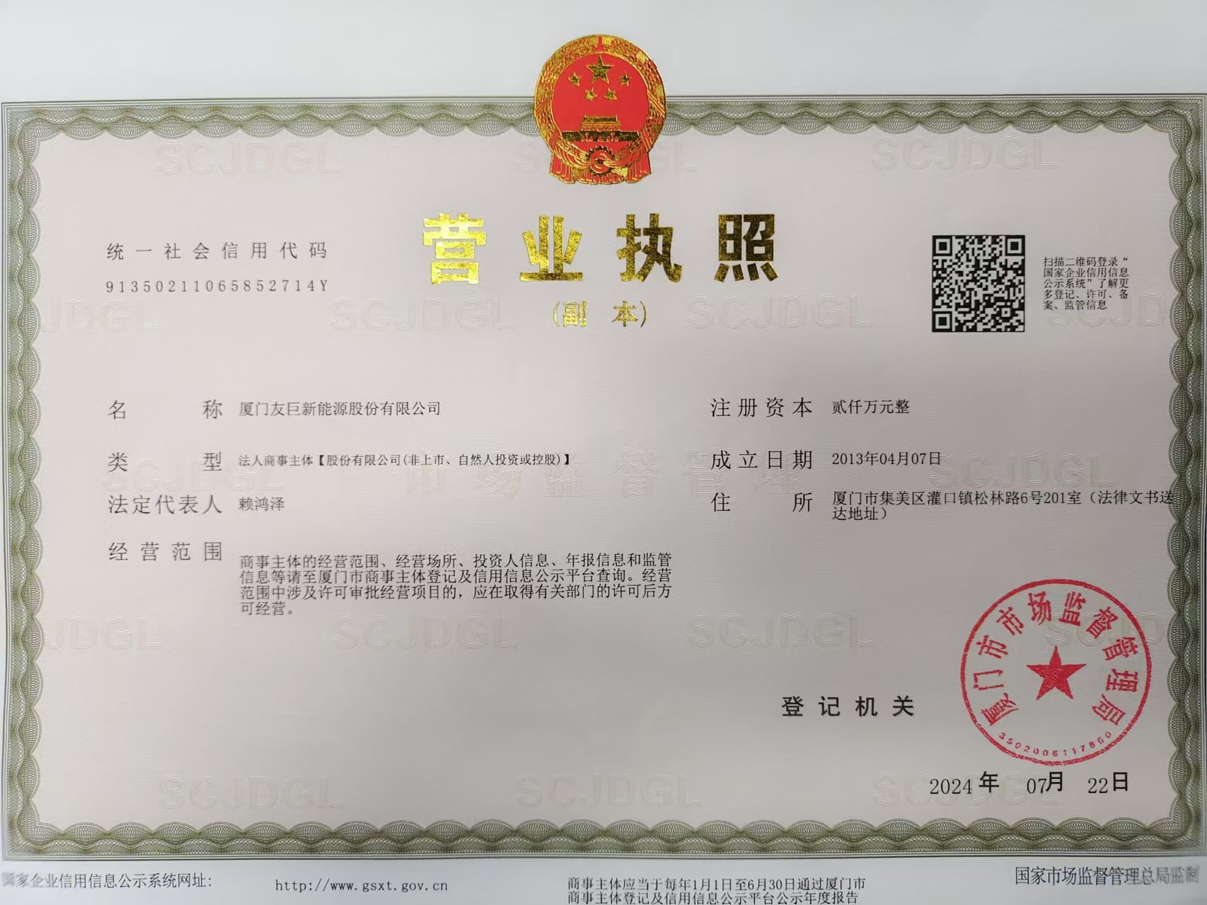 法人 营业执照编号 : 91350211065852714Y year_established : 2013-04-07 有效期 : 2013-04-07 — 2033-04-06 注册地址 : Room 201, No. 6, Songlin Road, Guankou Town, Jimei District, Xiamen City, Fujian Province, China 公司地址 : Office: Area A, 2nd Floor, No. 6 Factory Building, Songlin Road, Guankou Town, Jimei District, Xiamen City, Fujian Province, China; Factory: No. 803, Guankou South Road, Jimei District, Xiamen City, Fujian Province, China |