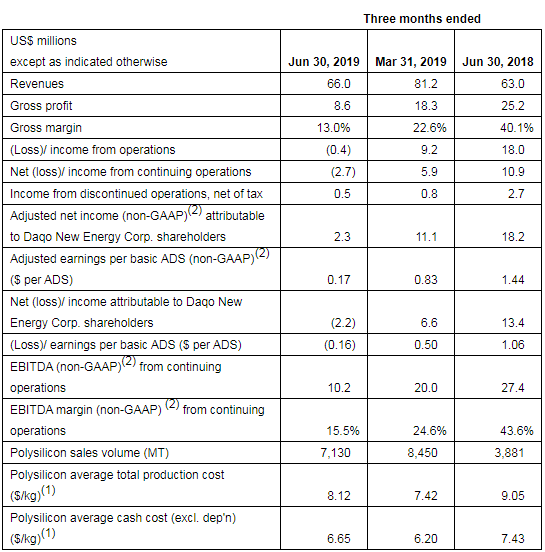 - Adjusted net income (non-GAAP)(2) attributable to Daqo New Energy shareholders was $2.3 million in Q2 2019, compared to $11.1 million in Q1 2019 and $18.2 million in Q2 2018.