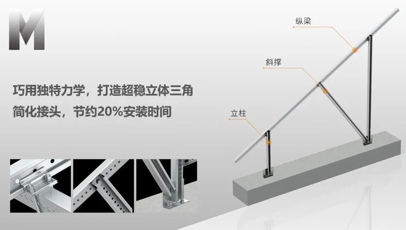 系统主体结构上,立柱、纵梁及斜撑巧妙地利用力学原理,打造超稳固立体三角结构。从安装上简化了接头,节省了20%以上的安装时间,大大提高了安装效率。同时得益于三角结构,整套系统牢固可靠,可抗16级以下台风。