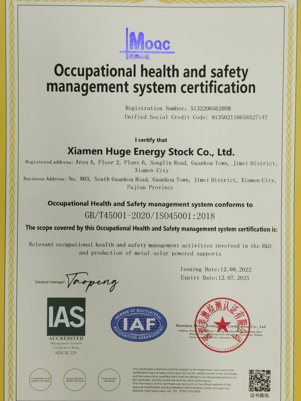 In the pursuit of excellence and technology innovation, and with over 100 R&D engineers' expertise, Huge Energy has obtained 80+ patents and our products have attained UL, TUV, JIS, AS/NZS, IEC, CE certifications, Wind Tunnel Tests, etc. Meanwhile, we have passed ISO9001, ISO45001, ISO14001, and other quality management system certifications.