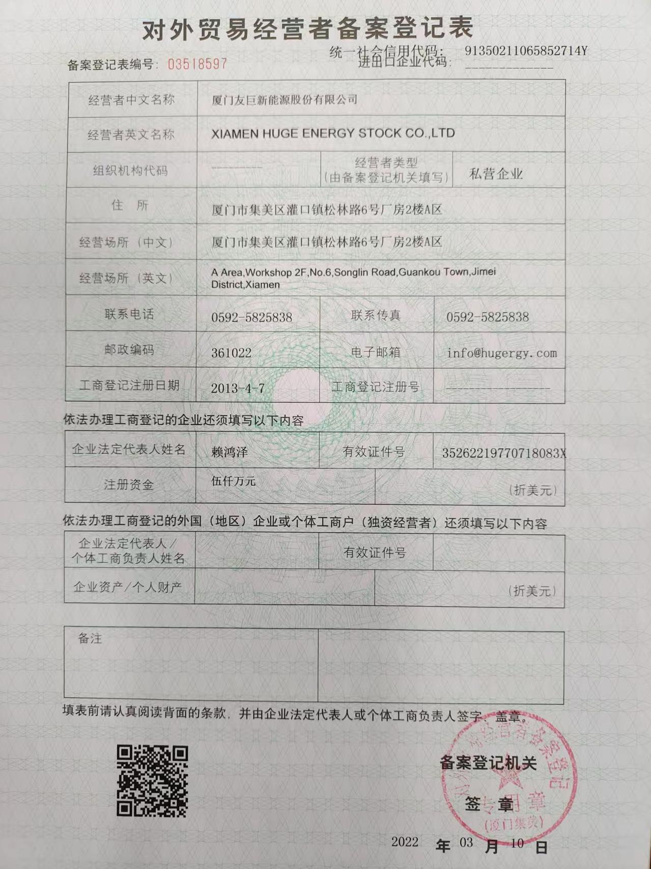 法人 营业执照编号 : 91350211065852714Y year_established : 2013-04-07 有效期 : 2013-04-07 — 2033-04-06 注册地址 : Room 201, No. 6, Songlin Road, Guankou Town, Jimei District, Xiamen City, Fujian Province, China 公司地址 : Office: Area A, 2nd Floor, No. 6 Factory Building, Songlin Road, Guankou Town, Jimei District, Xiamen City, Fujian Province, China; Factory: No. 803, Guankou South Road, Jimei District, Xiamen City, Fujian Province, China |