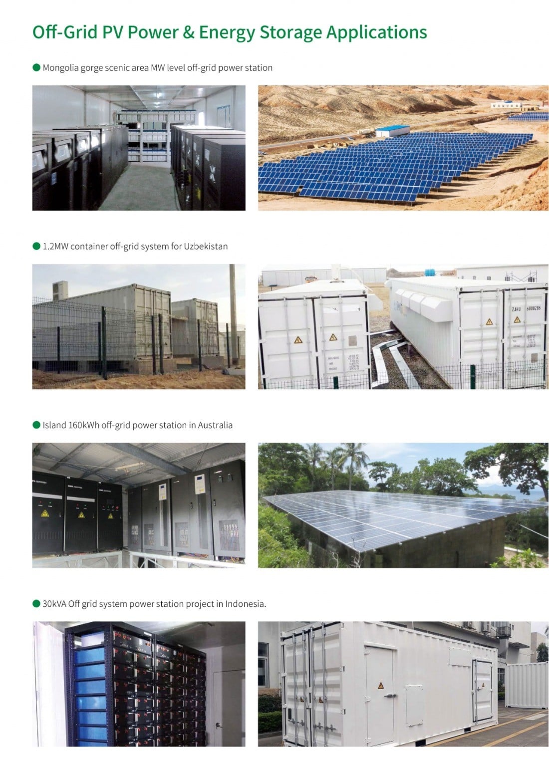 Its offerings include reliable new energy systems like hundreds of MW on-grid solutions, off-grid systems from 500VA to 1.2MW, hybrid systems from 1KW to 1MW, energy storage systems from 2KW to 500KW, string inverters from 1.5KW to 60KW, and central inverters up to 1.26mw.