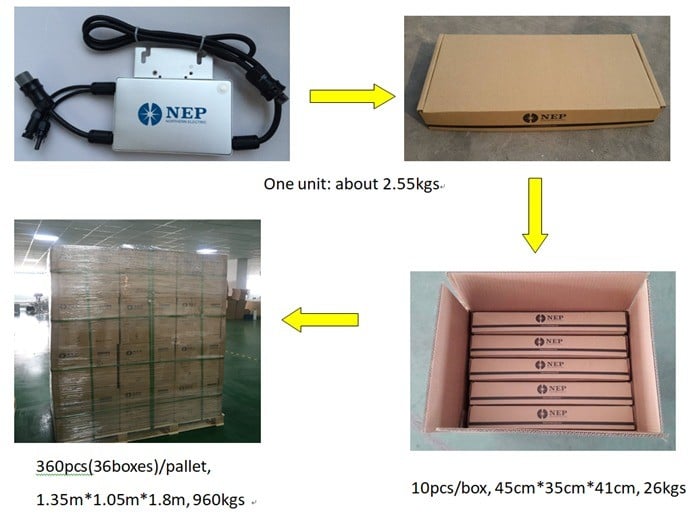 2. Pack the micro-inverter unity in one small box, with the size is: 0.43m*0.2m*0.06m≈0.0052m3, weight is about 2.7Kg