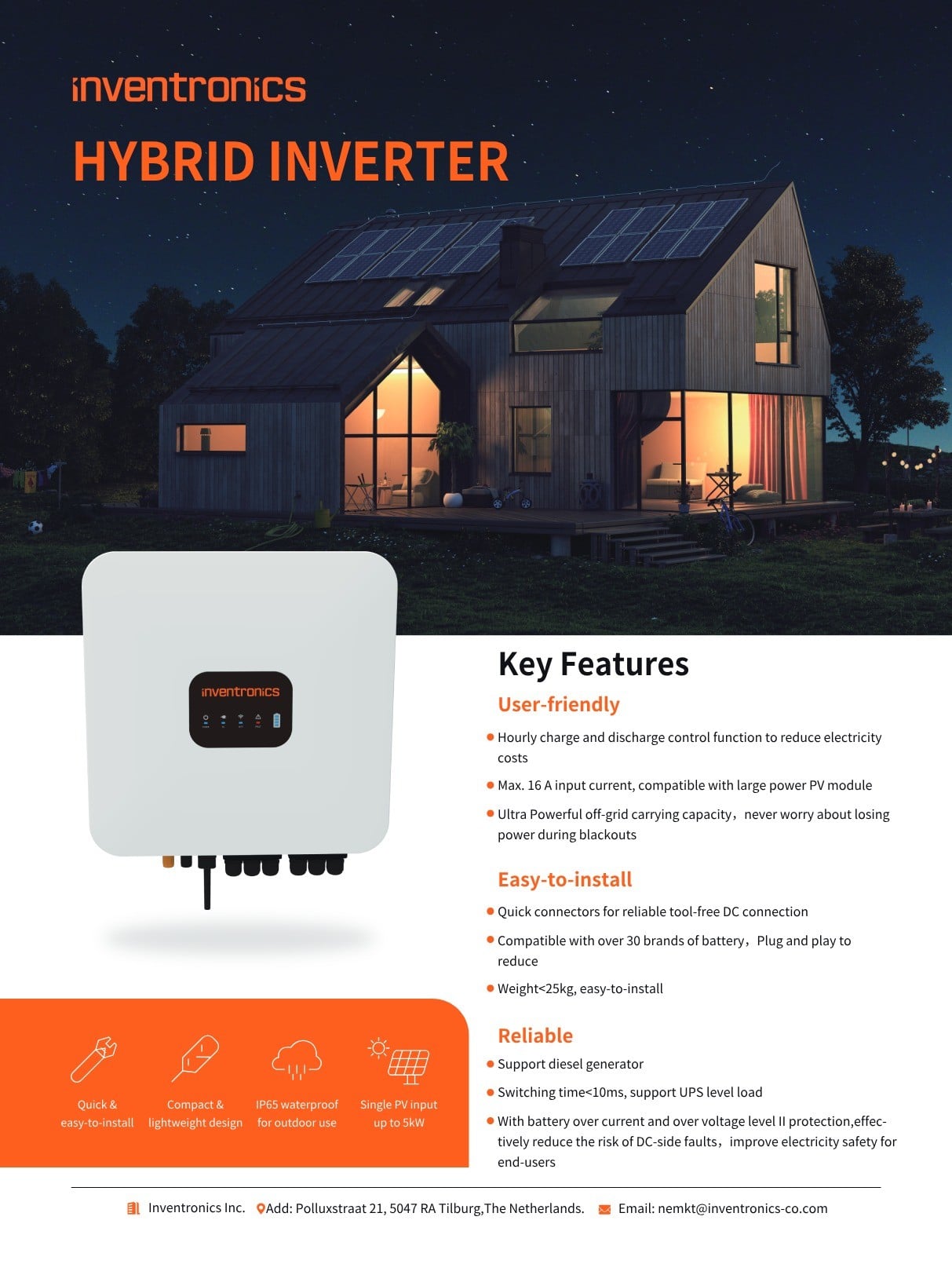 The Inventronics Hybrid Inverter features user-friendly hourly charge/discharge control and a 16A maximum input current, making it ideal for high-power photovoltaic modules. Its robust off-grid capacity ensures continuous power during outages. Installation is simplified with tool-free DC connectors, compatibility with 30+ battery brands, and a lightweight design (under 25kg).
