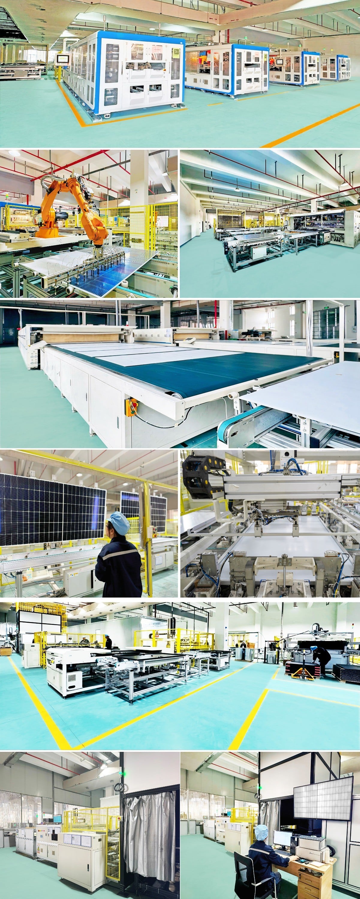 公司拥有多条新型智慧生产线,自能实现激光无损切片、毫米级定位焊接、自动化排版、智能设备检测等全自动生产。现有生产线年产能1GW,覆盖晶硅166、182P、183.75N、210R、210N全尺寸的组件生产,实现PERC、TOPCon、矩形双玻等组件生产,并能按照客户需求提供定制服务。我们已经通过了TUV,CE,ISO,CGC等认证。