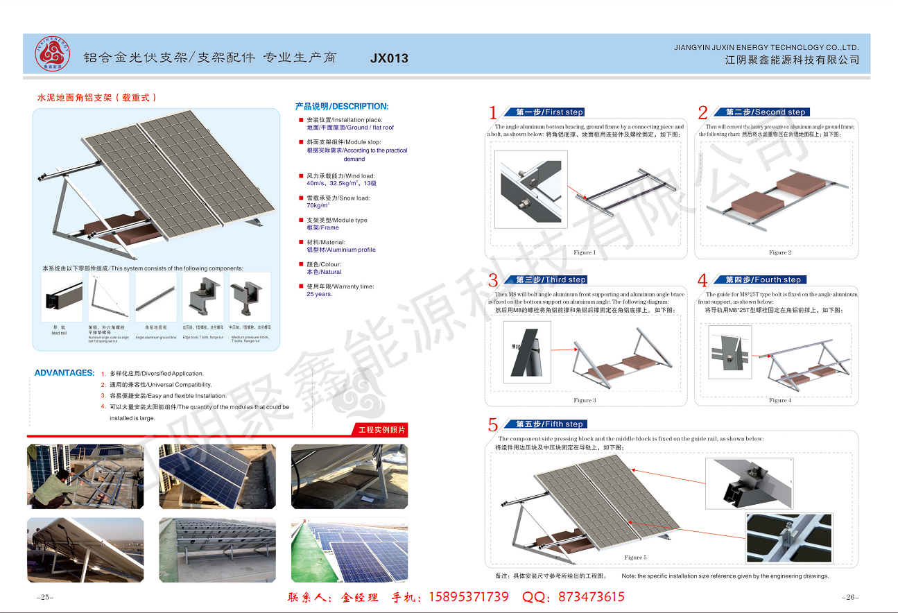 主营产品有:彩钢瓦屋面光伏支架、琉璃瓦屋面光伏支架、混凝土平屋顶光伏支架、地面铝合金光伏支架、可调角度光伏支架、防水光伏支架;铝合金中压块边压块,彩钢瓦夹具,铝合金导轨等。