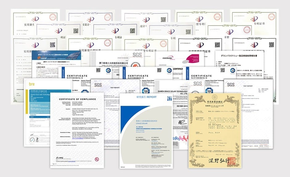 Grace Solar PV Mounting System is certified by numerous authoritative bodies, including ISO9001, RWDI, JIS, SGS, UL, TUV, MCS, AS/NZS1170, and holds multiple solar PV patents, including Japanese patents.