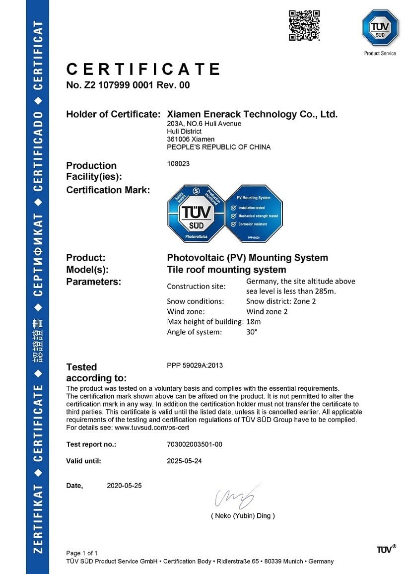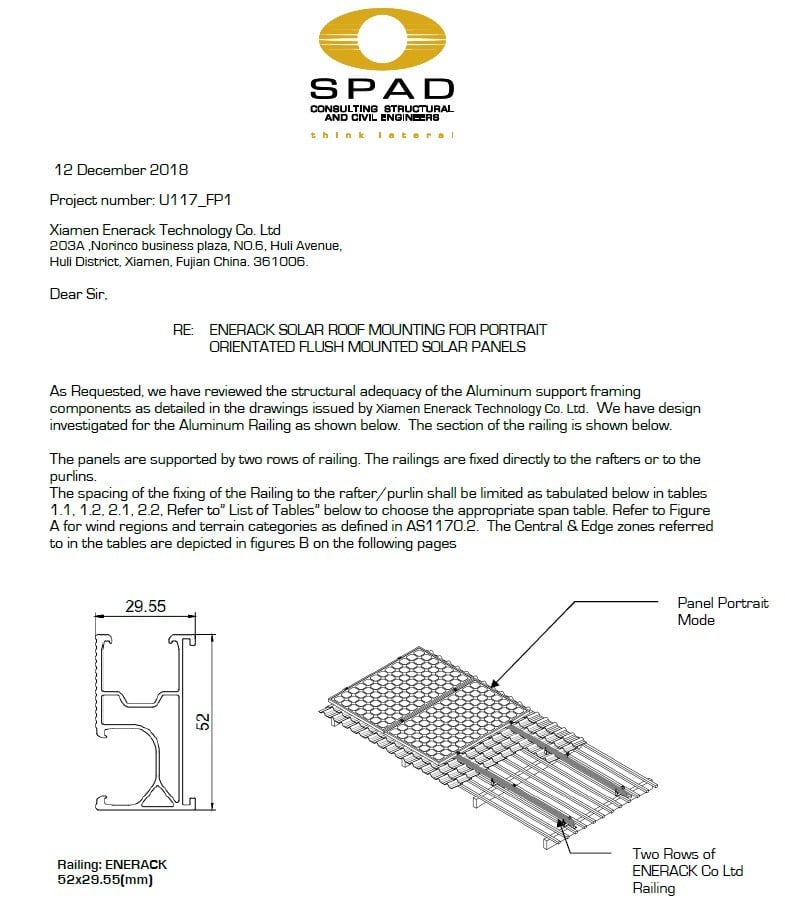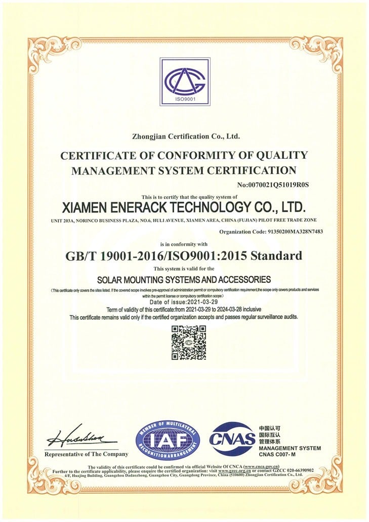 Enerack company owns a factory, with more than 80 skilled workers, who have over 15 years of solar production experience. With complete R&D processing and high manufacturing capacity, strictly following ISO9001 quality control system. Enerack products have passed the TUV, CE, AS/NZS1170.2 certifications, and are tested with SGS. We have passed the ISO9001:2015 quality management system certification which is quality assurance for the products purchased by our customers. Our products are designed strictly by AS/NZS1170.2, JIS C 8955, MCS012, TUV, UL2703, European building codes, and other standards, ensuring that every code and regulation fully complies with all applicable local or national building codes.