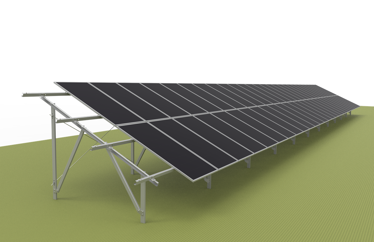 国瑞能双支柱支架,适合于各种地形的大型地面电站,其采用开口型碳钢截面做支柱,配合打桩设备,对比地螺栓可提高50%的安装速度,并且免除了基础与柱子的安装步骤,极大地节约了安装时间,使安装更加简便;其转动头部可实现3个方位大角度转动,可适用于各种斜坡,波浪形地面的安装