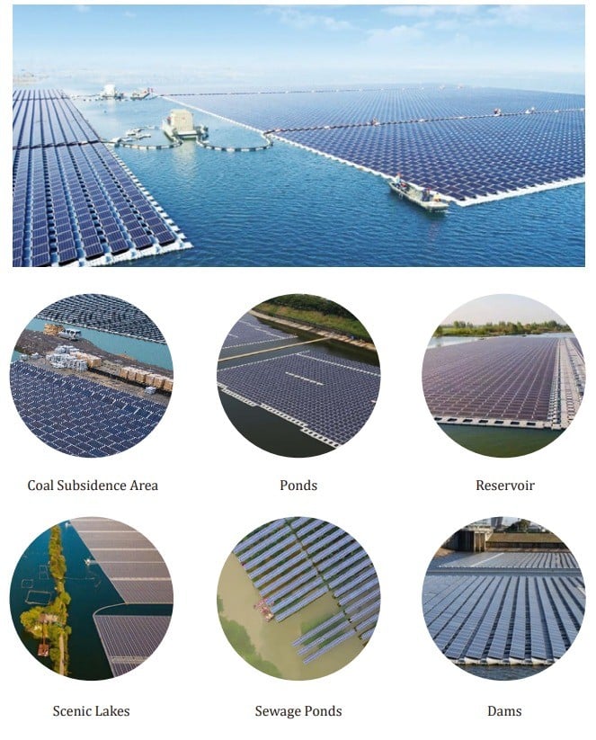 Floating Solar PV Power Generation System is built on water surfaces like coal subsidence areas, ponds, reservoirs, scenic lakes, sewage ponds, and dams etc., which can not only solve the problems that the traditional ground pv power generation system requires large ground area, but also can increase the ROI. Specialized design and solution can increase the efficiency of project installation and extremely reduce the installation cost.