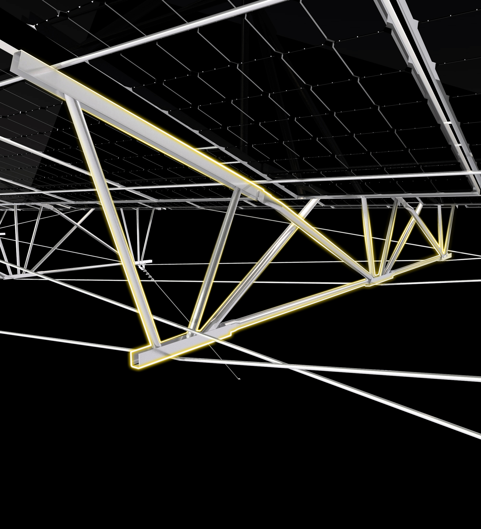 该支架系统的部分结构件采用钢索替代,节约30%钢材用量,比传统电站减少5~10%的投资成本。预应力悬索独特的结构设计,为系统施加特定张紧力,满足光伏组件铺设需求。同国际权威风工程实验室合作,及知名大学教授对结构进行复核验算,系统结构稳定抗风能力强,60米大跨距,10米高净空,可适用各种复杂地形,实现更大装机容量。