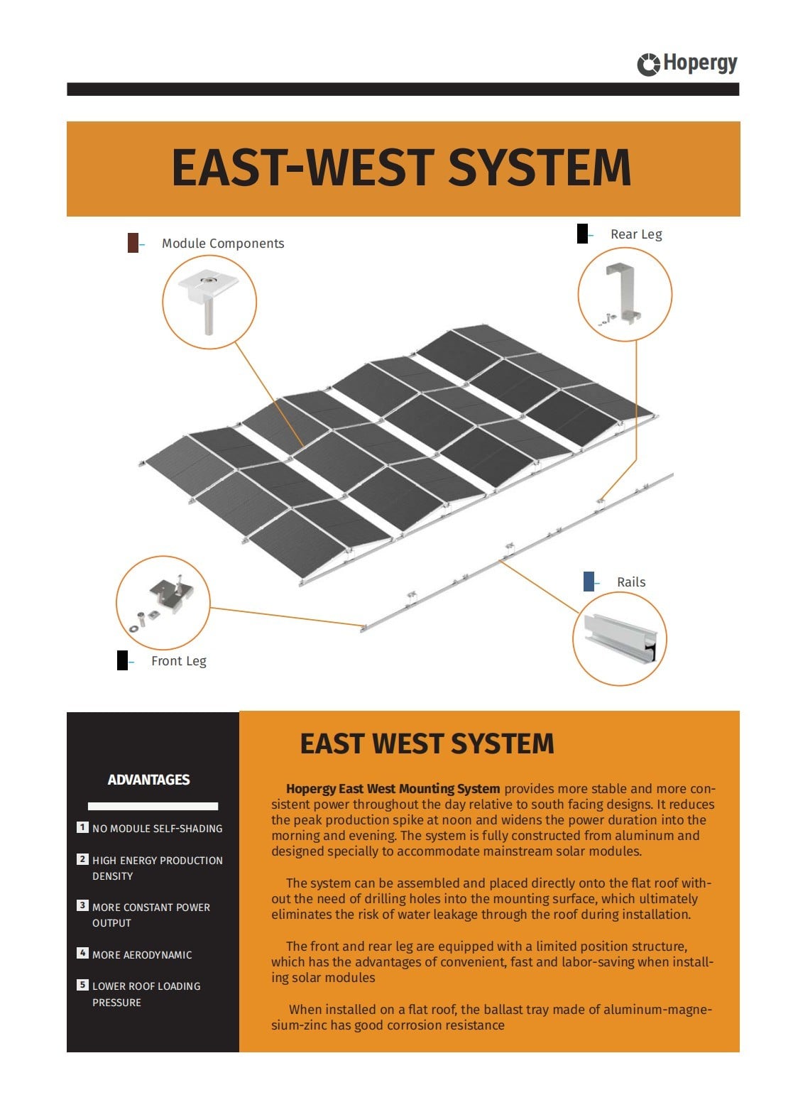 Hopergy East West Mounting System provides more stable and more consistent power throughout the day relative to south facing designs. It reduces the peak production spike at noon and widens the power duration into the morning and evening. The system is fully constructed from aluminum and designed specially to accommodate mainstream solar modules. The system can be assembled and placed directly onto the flat roof without the need of drilling holes into the mounting surface, which ultimately eliminates the risk of water leakage through the roof during installation. The front and rear leg are equipped with a limited position structure, which has the advantages of convenient, fast and laborsaving when installing solar modules When installed on a flat roof, the ballast tray made of aluminummagnesiumzinc has good corrosion resistance.