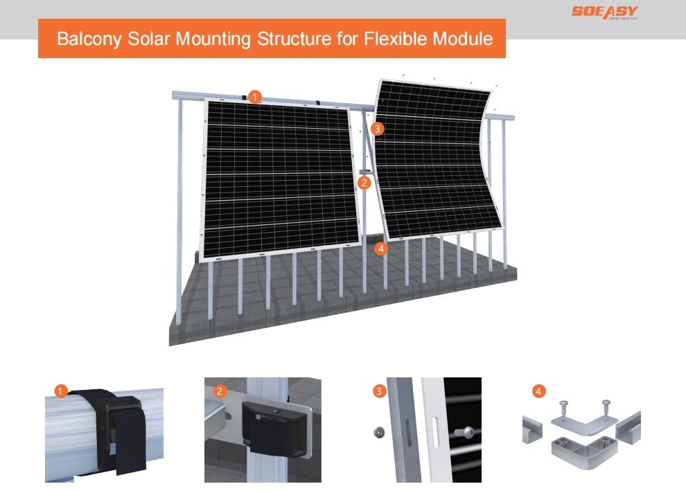 With the rise of solar balcony, SOEASY has developed mounting brackets for different types of solar modules. This is a balcony bracket specially designed for installing flexible module. The aluminum alloy frame supports the flexible components, and the solid textile straps with adjustable support feet fix the overall photovoltaic components on the balcony fence. The whole installation process is smooth and convenient, which can meet the installation and construction of household photovoltaic systems in general apartments. Let more people enjoy the convenience brought by photovoltaics. Any fence balcony fence, exposed railing, garden fence and more can be installed.