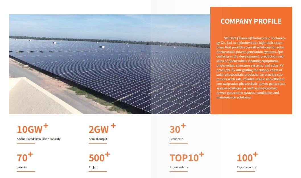 SOEASY is a EPC-acclaimed supplier of photovoltaic mounting systems. It integrates production, marketing, research and development, and design in one. We commit to providing customers with safe, reliable, stable and efficient one-stop solar photovoltaic power generation system solutions since 2002. And we focuses on independent research, development and innovation of solar products. The R&D team provides strong technical support to Enable clients to implement freely design projects. The main products include solar bracket, solar system, solar carport, solar cleaning machine etc. Since its establishment, the company has successively obtained more than 60 patent certificates, ISO9001 quality management certification, government qualified suppliers, etc.
