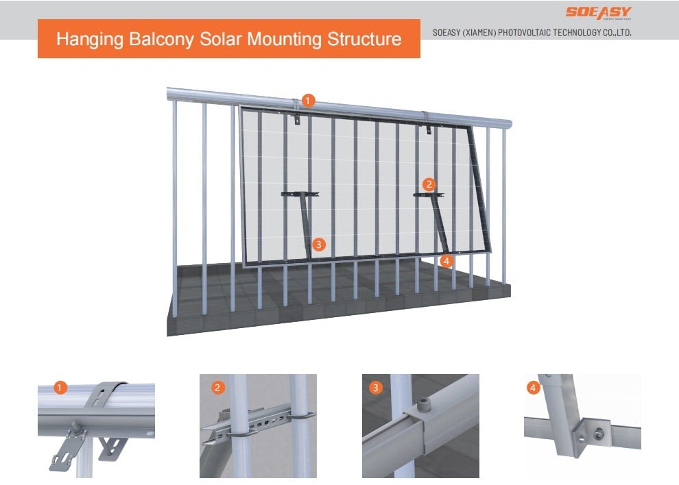 The fixed balcony solar mounting structure is the most simple direct system in the SOEASY balcony support series. A photovoltaic module can be installed with only 4 micro-supports. The modules are fixed parallel to the balcony fence, which can easily meet the installation and construction of general apartment household photovoltaic systems. The extremely flexible installation method allows more people to enjoy the photovoltaic dividend. Any palisade balcony fencing, exposed railings, garden fencing and more can be installed.