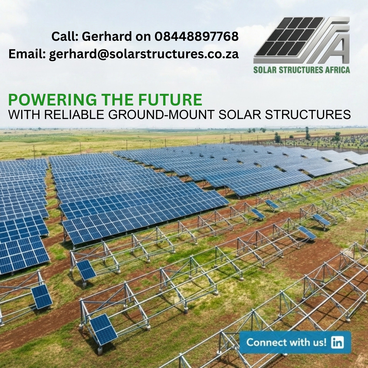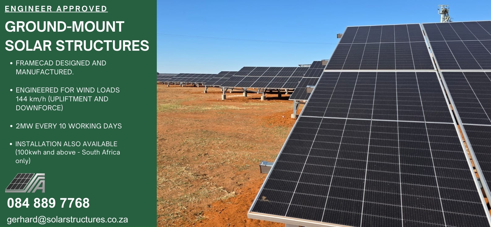Solar Structures Africa is a leading South African manufacturer of lightweight steel solar ground mount structures. We specialize in innovative, sustainable solutions for solar energy ground mounting systems, using high-quality AZ150 G550 cold form lightweight steel. Our structures are cost-effective, durable, and engineered to meet all load and upliftment requirements. We offer installation services for structures of 100kw and above (South Africa only). With a manufacturing capacity of 2MW every 10 working days, we use the world renown Framecad machines and software to ensure quality and precision of all structures and is engineer approved. We export worldwide.