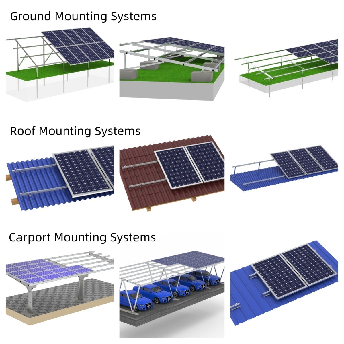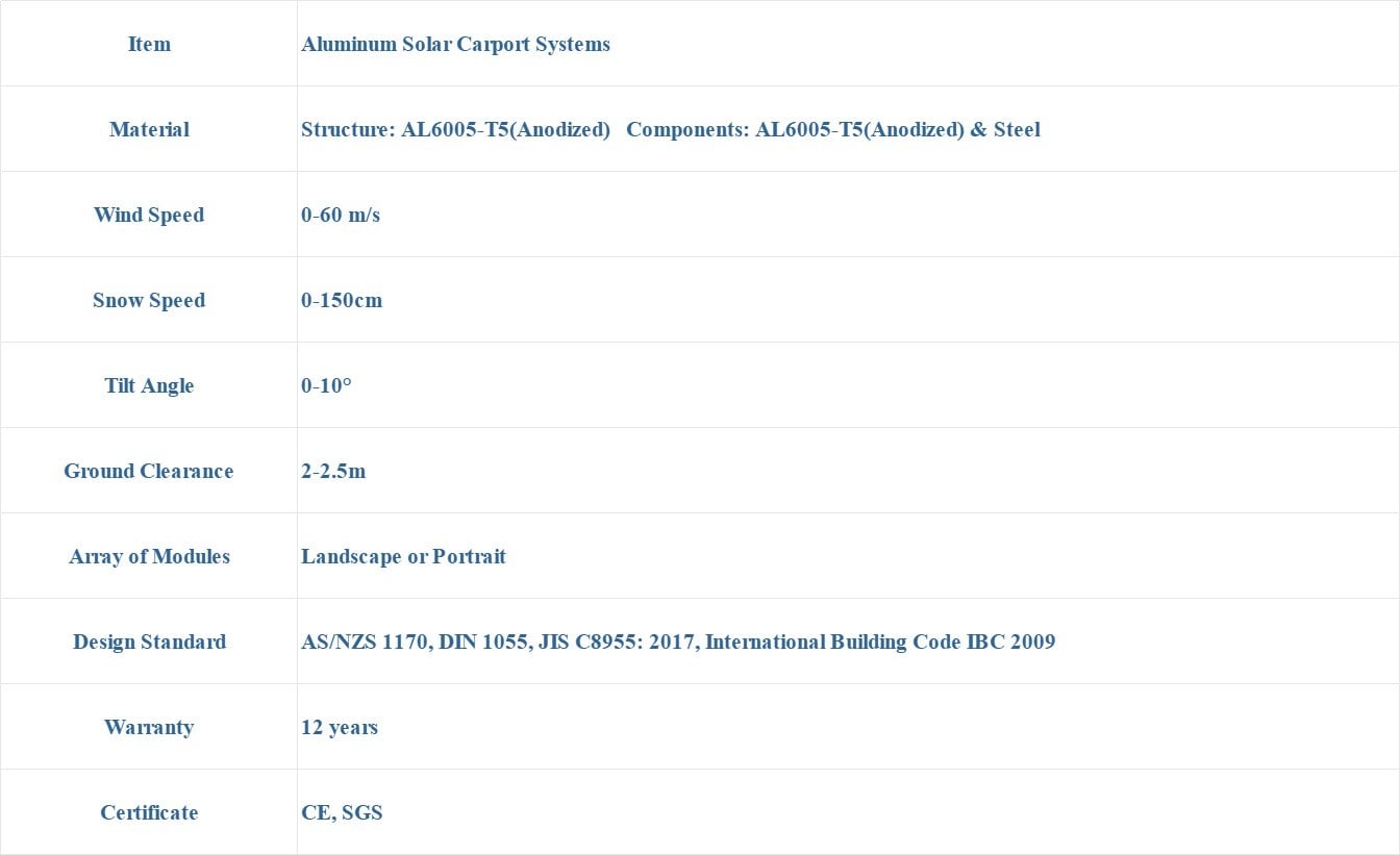The solar carport is made from AL6005-T5 material, with high strength and stylish appearance. Unlike traditional carports, solar carports have the added function of using solar energy to generate electricity. The electricity generated can be used to charge electric vehicles or for home use or for sale on the grid. Solar carports can be applied to ordinary residential small carports or large commercial parking lots. In addition, the solar carport can park small cars and even large trucks. This is a good solution for clean energy applications and is very popular around the world.