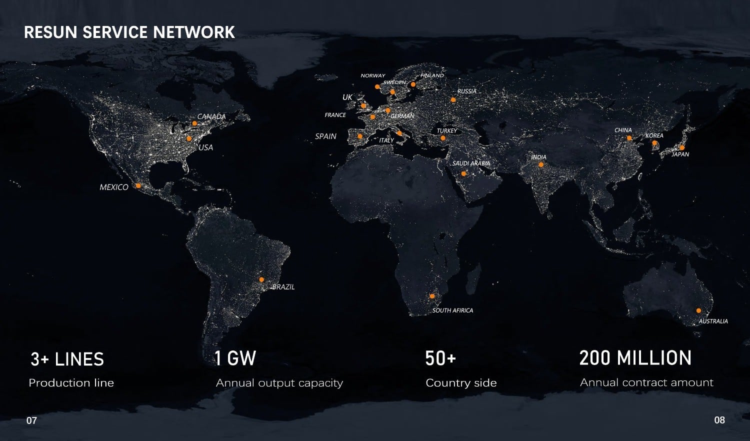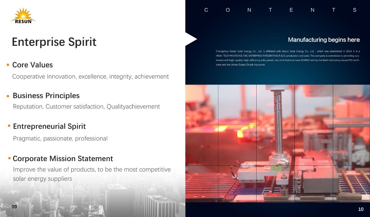 Resun Solar专门提供高质量和高成本效益的太阳能组件。凭借其2家通过ISO9001和14001认证的制造工厂,全系列Resun配线架通过TUV IEC61215、IEC61730、IEC61701、CEC、EMC、LVD、CE认证,并由PI Berlin lab批准免PID,由美国CHUBB保险集团投保。 Resun Solar成立于2005年,拥有1GW的生产能力,在基于MW的中大型地面项目和基于KW的小型独立屋顶系统方面拥有丰富的经验,并且Resun Solar作为世界银行太阳能项目的合格太阳能家庭系统供应商拥有超过15年的经验,这些项目分布在大多数欧洲国家、澳大利亚、加拿大、南美、非洲、中东和亚洲。 Resun solar坚持其方便客户和与不同太阳能系统组件合作伙伴建立良好关系的双赢合作目标,建立了一个行业联盟,提供太阳能发电系统集成解决方案和太阳能应用产品。