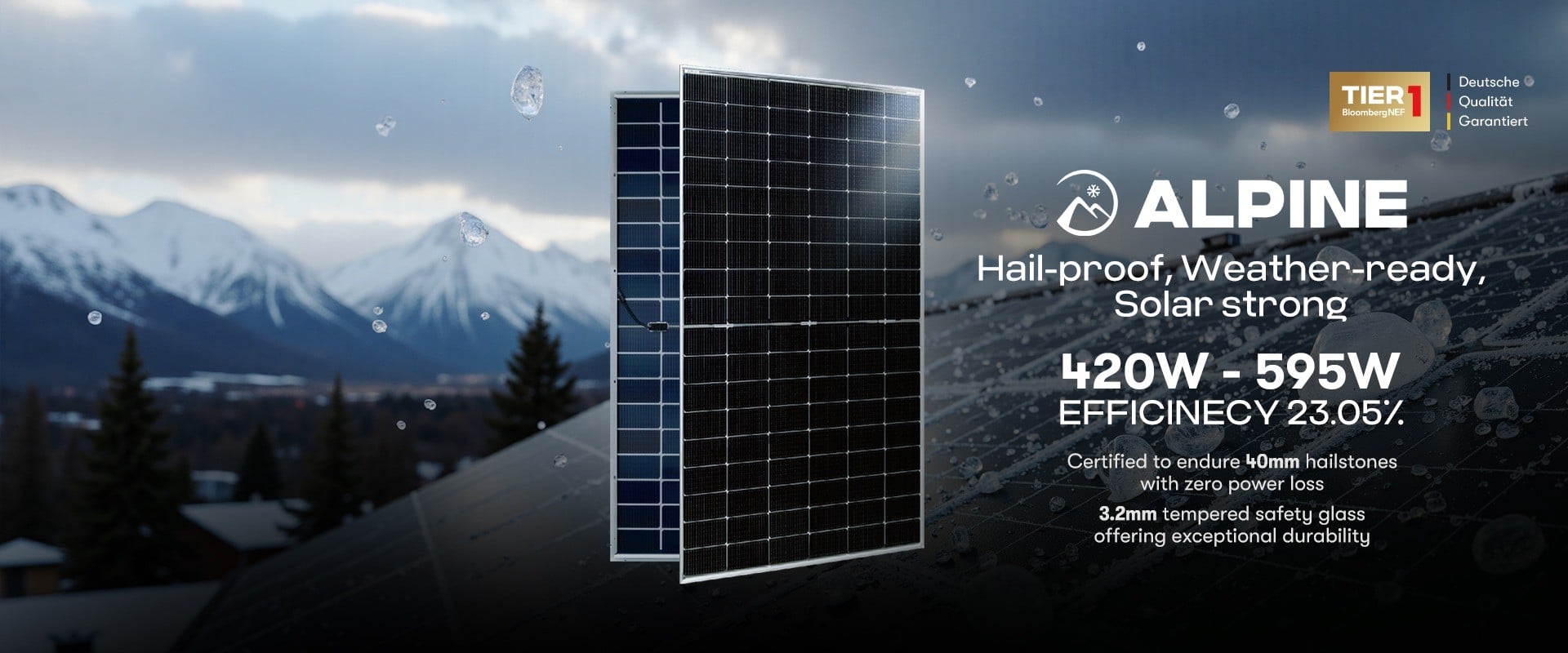 Advanced Materials for Extreme Environments - The Alpine Series features 3.2mm tempered safety glass. This advanced design enables the Alpine Series to withstand hailstones of up to 40mm in diameter at speeds of 27.54 meters per second, a standard far exceeding the IEC requirement of 25mm hailstones at 23m/s. Not only do tests show hailstones disintegrating upon impact, but third-party results from TÜV Rheinland also confirm no visual defects and minimal power degradation after hailstone impacts.