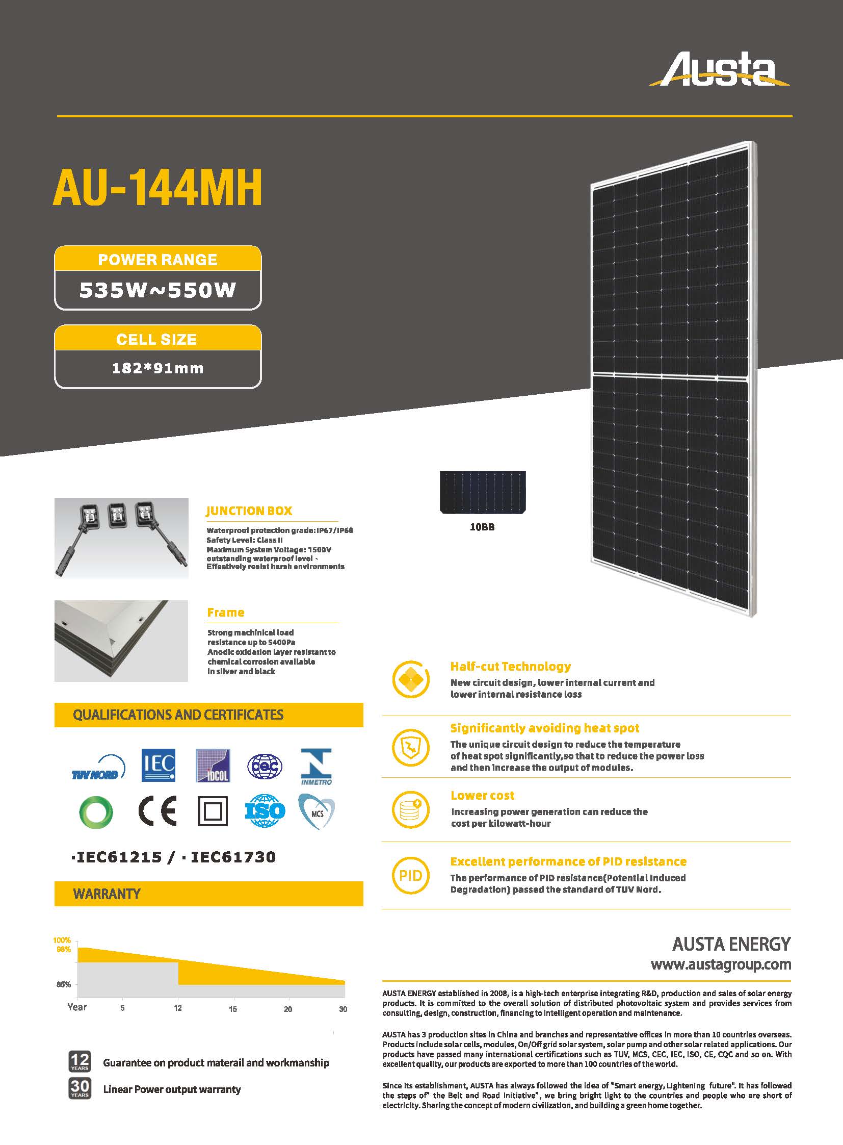 | 功率输出保证 | 98 % 12年年限质保,85 % 30年年限质保 | |