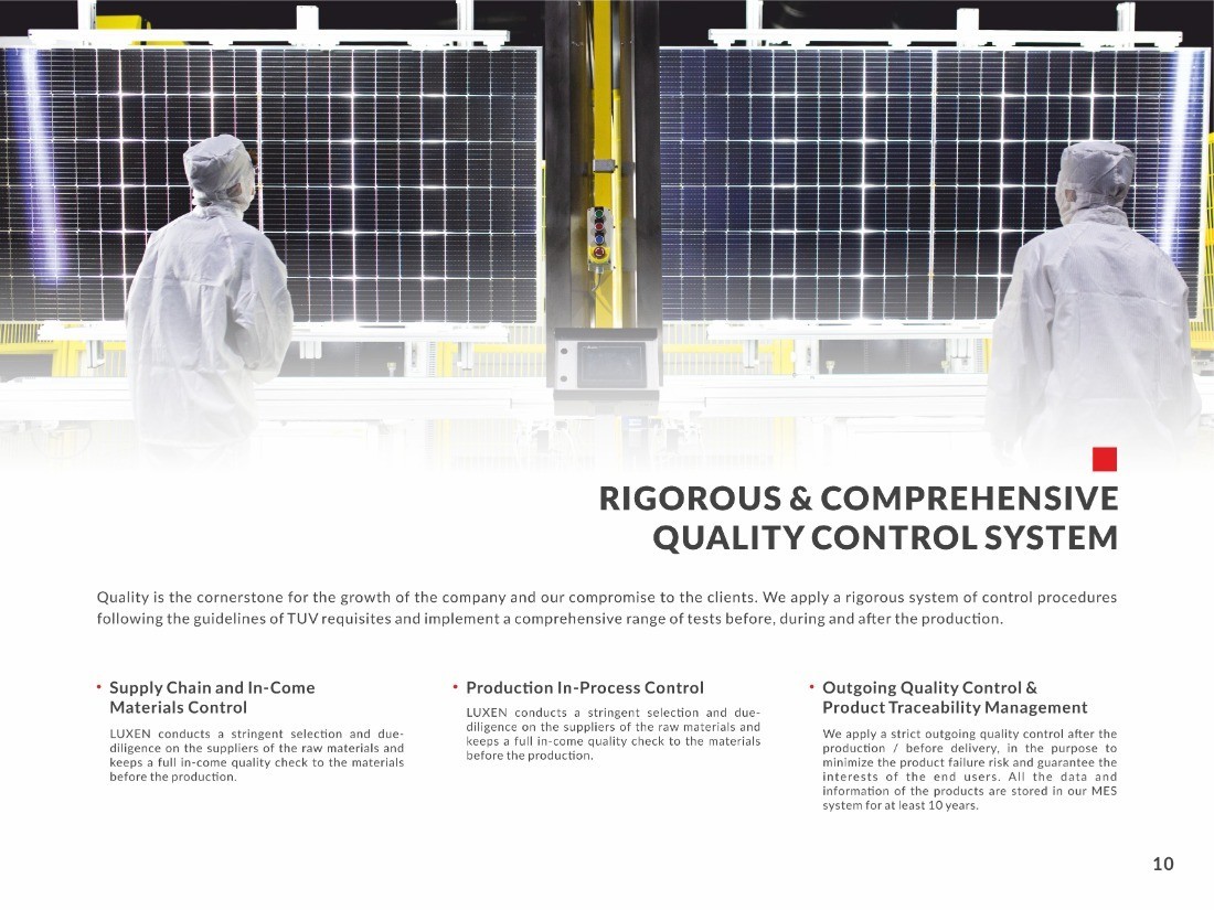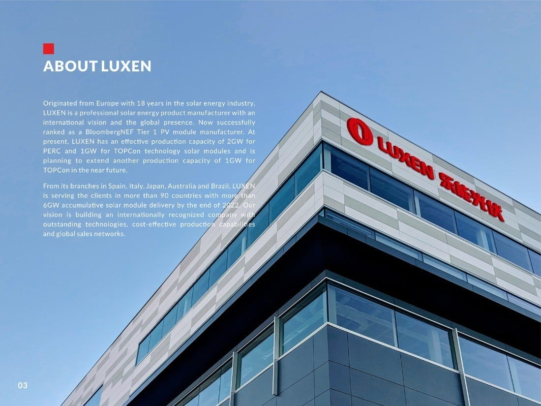 Luxen was founded in Spain in 2005. In 2011, Luxen set up its own factory in China. Five years later, the company ranks in the top 50 in global exports. In 2017, production was expanded and modernized with smart technologies according to the 4.0 industry revolution. By 2018, Luxen had growing sales activities to over 70 countries and was listed as one of the top 20 global export companies. As of 2023, Luxen has a production capacity of 3 GW and is a recognized Tier 1 manufacturer. It is internationally acknowledged for its supreme quality, reliability, and round-the-clock aftersales support. Luxen has an Operational HQ for Europe in Vienna, Austria, representative offices across Europe and Asia, and a state-of-the-art production facility in China.