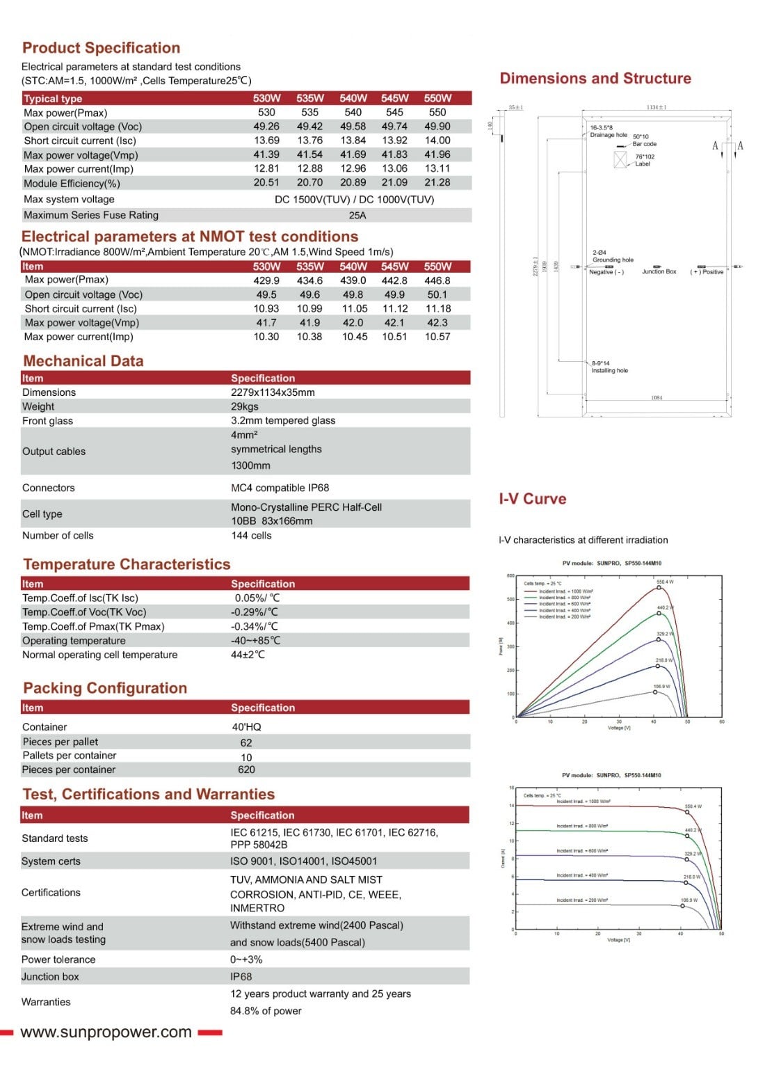 | 温度系数(Voc) | -0.29 %/°C | |||||