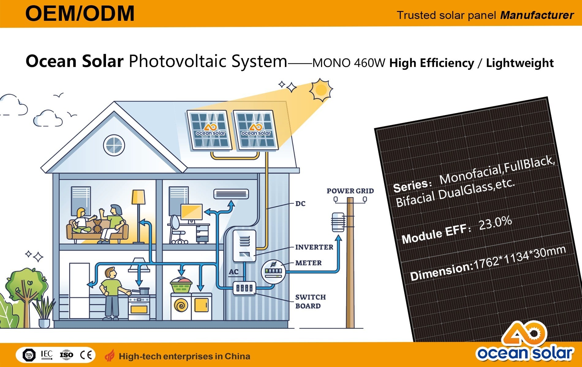 Ocean solar是一家专注于生产高效单晶和多晶太阳能电池组件的高新技术企业,服务于国内外从事离网和并网太阳能系统的安装商、经销商和工厂。 为客户提供高效、安全、可靠、美观且价格有竞争力的太阳能电池板。
