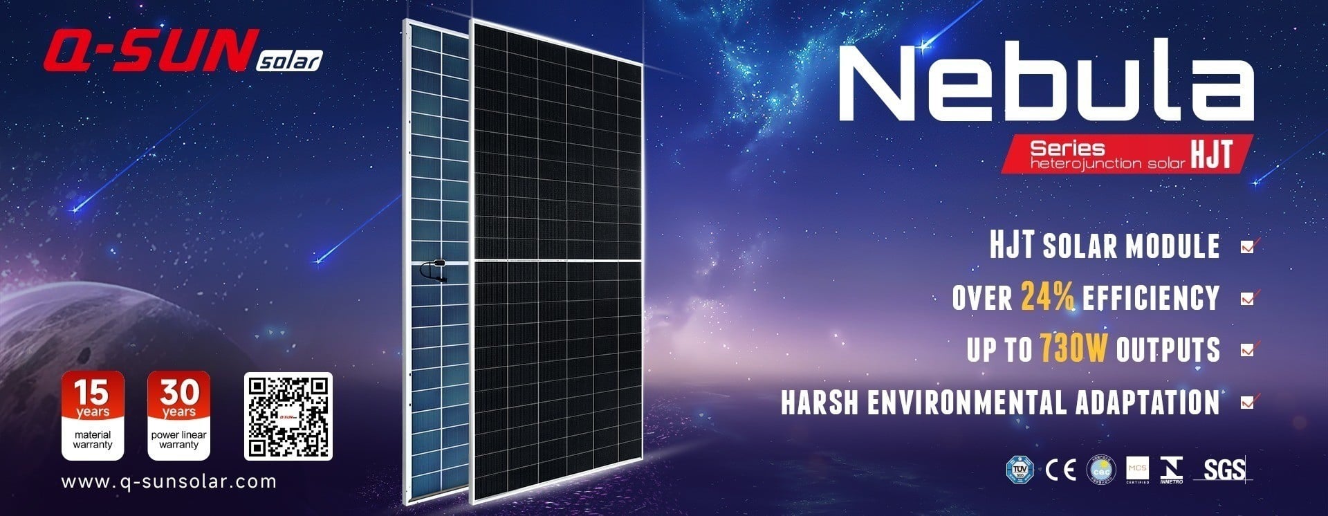 The Q-Sun Solar Nebula Series is an advanced range of heterojunction solar cells (HJT) that features high-efficiency energy absorption and conversion capabilities.