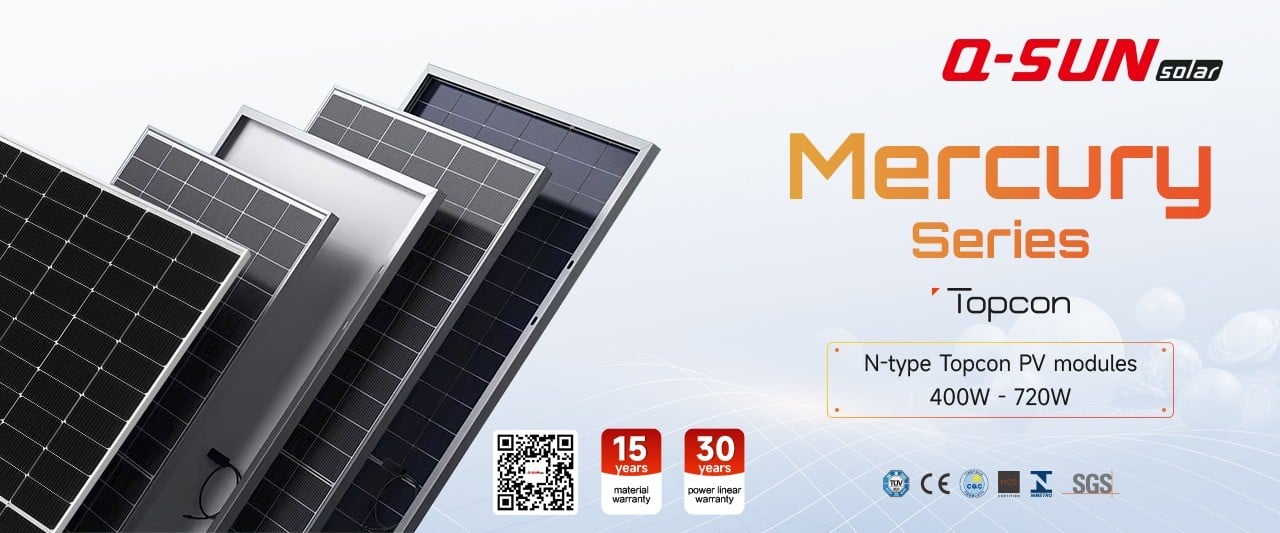 The Q-Sun Solar Mercury Series represents the latest advancement in photovoltaic technology with our N-type Topcon PV modules. This series offers power outputs ranging from 400W to 720W, with efficiency levels between 22.5% and 23%.