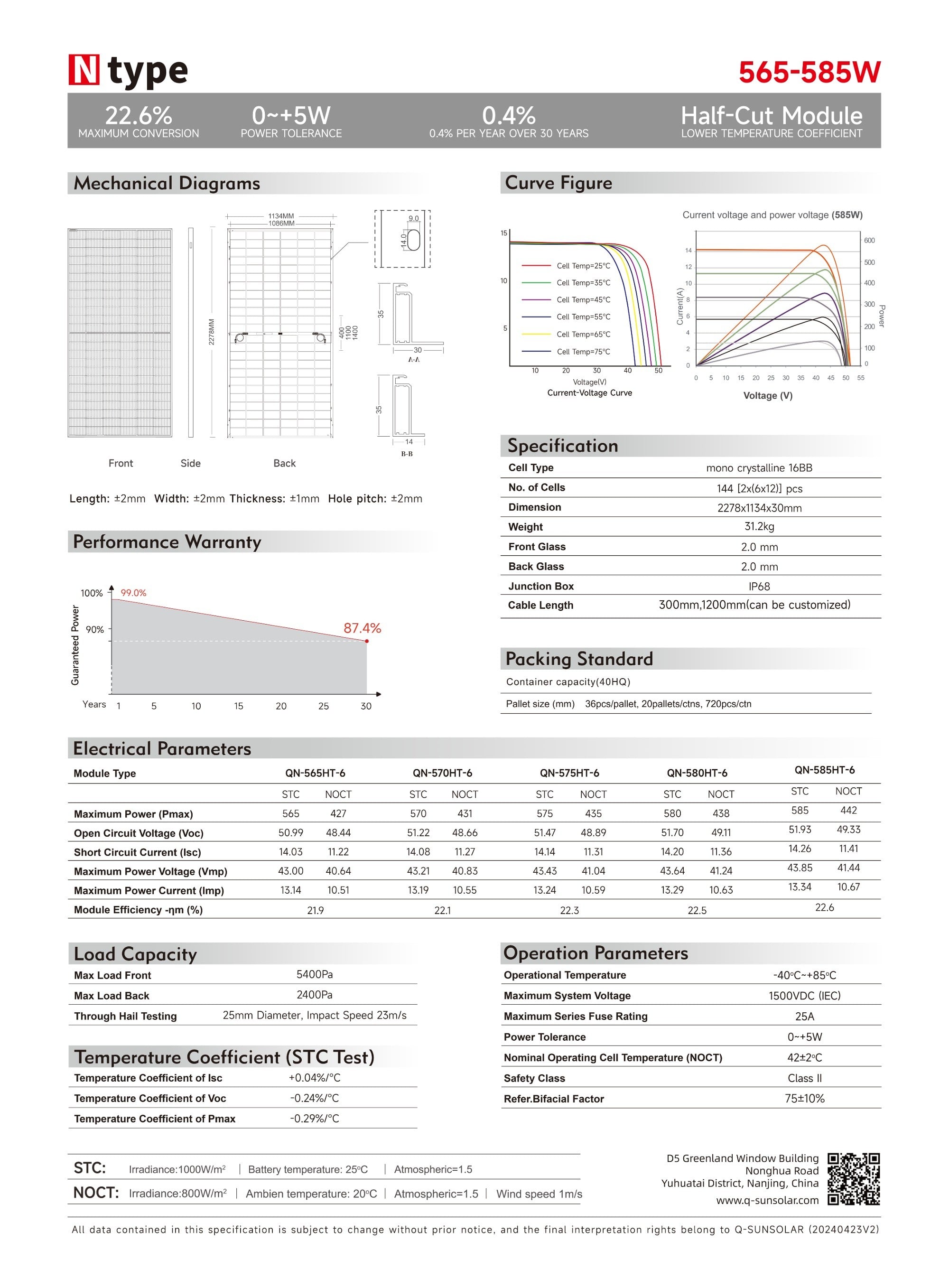 | 温度系数(Voc) | -0.24 %/°C | |||||
