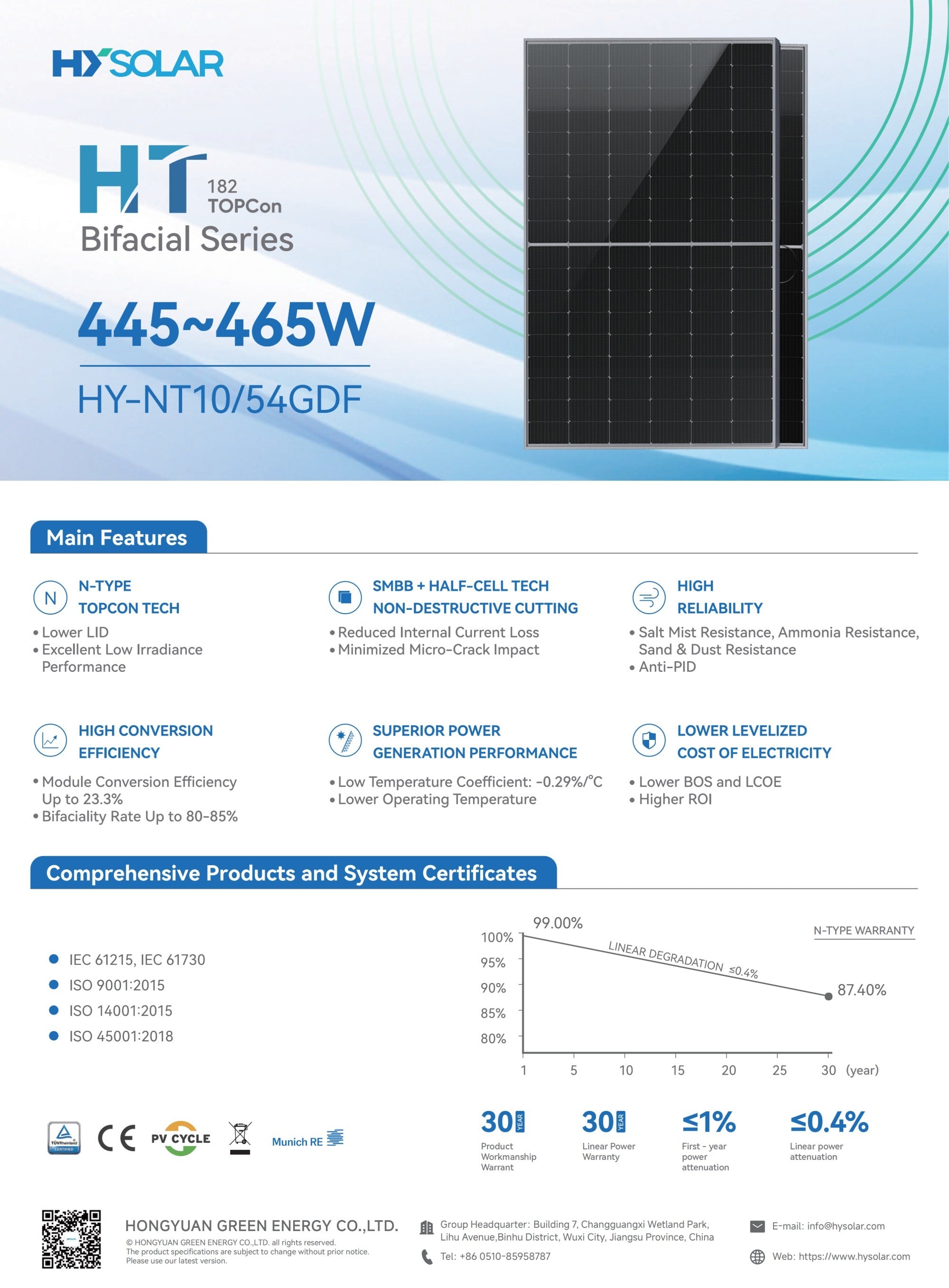 I highly recommend HY Solar and their exceptional range of photovoltaic (PV) panel products. With a commitment to cutting-edge technology and sustainable energy solutions, HY Solar stands out as a reliable provider in the solar industry. Their PV panels boast impressive efficiency rates and durability, ensuring optimal performance and longevity. Moreover, HY Solar's dedication to innovation results in panels that are not only efficient but also aesthetically pleasing, making them an excellent choice for both residential and commercial installations. Whether you're looking to reduce your carbon footprint or invest in renewable energy, HY Solar's PV panels offer a dependable solution backed by years of expertise and customer satisfaction.