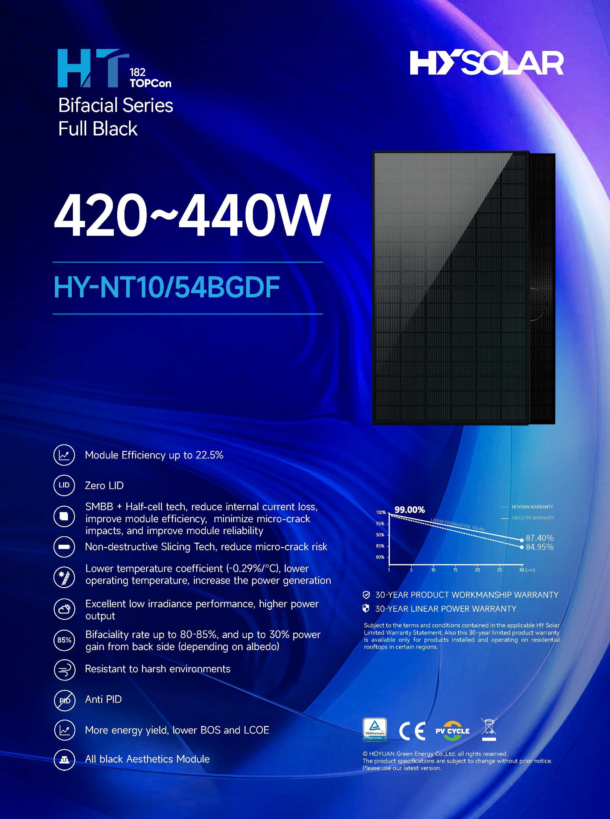 Lower temperature coefficient (-0.29%/℃), lower operating temperature, increase the power generation