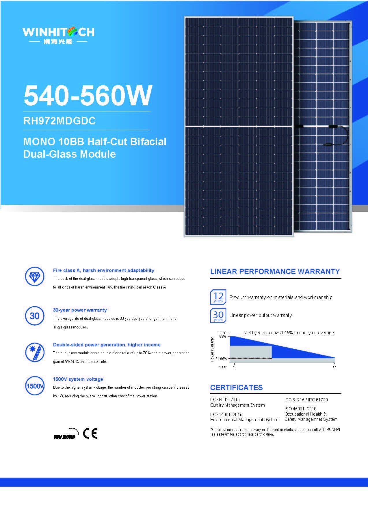The back of the dual-glass module adopts high transparent glass, which can adapt to all kinds of harsh environments, and the fire rating can reach Class A.