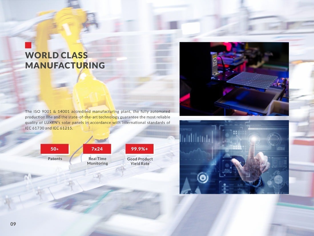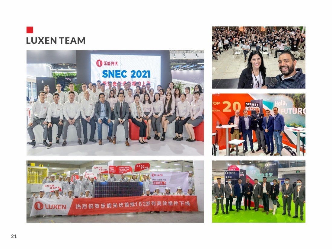 Luxen was founded in Spain in 2005. In 2011, Luxen set up its own factory in China. Five years later, the company ranks in the top 50 in global exports. In 2017, production was expanded and modernized with smart technologies according to the 4.0 industry revolution. By 2018, Luxen had growing sales activities to over 70 countries and was listed as one of the top 20 global export companies. As of 2023, Luxen has a production capacity of 3 GW and is a recognized Tier 1 manufacturer. It is internationally acknowledged for its supreme quality, reliability, and round-the-clock aftersales support. Luxen has an Operational HQ for Europe in Vienna, Austria, representative offices across Europe and Asia, and a state-of-the-art production facility in China.