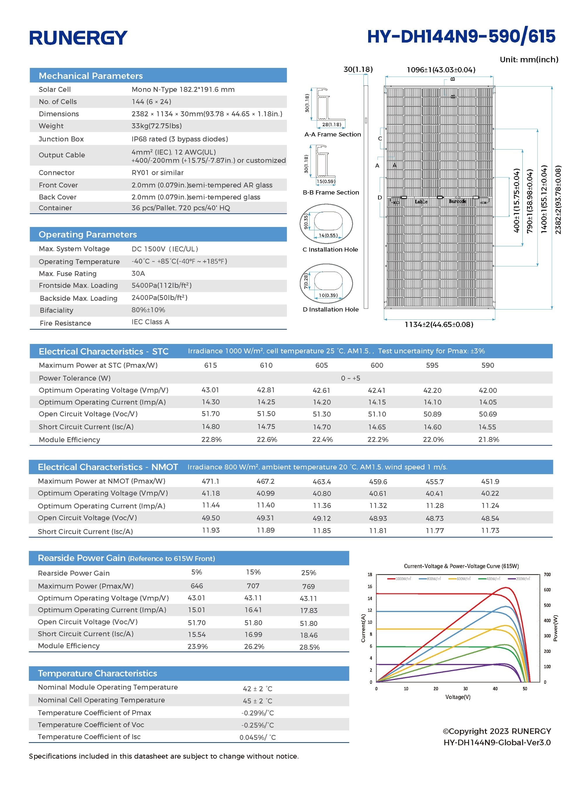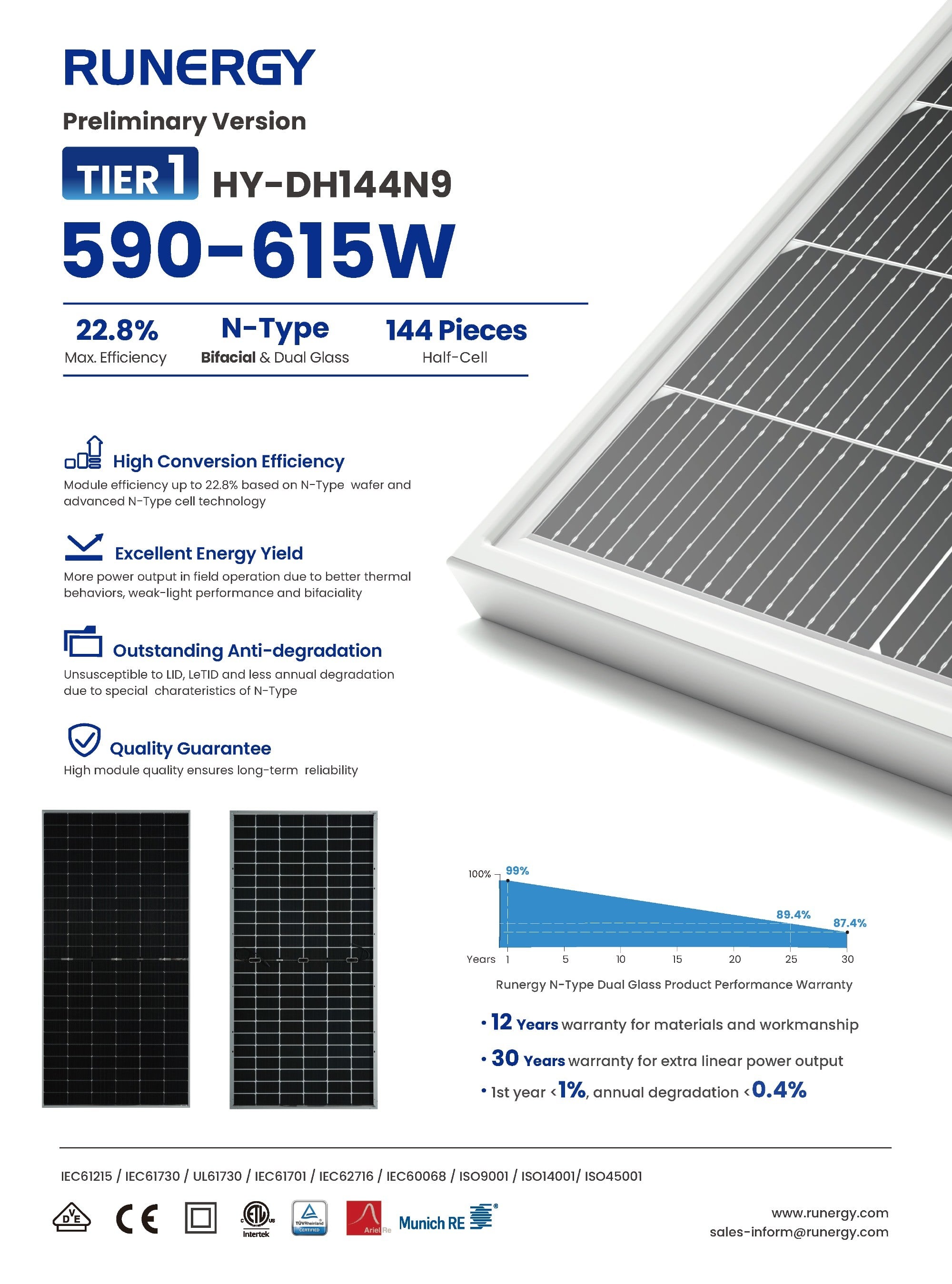 Our next-gen product platform, the Runergy H2 Series, features cutting-edge N-Type technology. Compared to the P-Type series, the N-Type series can help achieve a lower LCOE. It boasts a much lower temperature coefficient, better performance in low light, and lower long-term power degradation. Various tests indicate that, on average, N-type products can generate 3%-5% more electricity than typical P-type products of the same power.