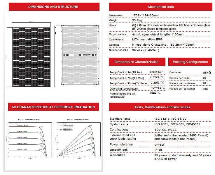 | 功率输出保证 | 89.4 % 25年年限质保,87.4 % 30年年限质保 | ||