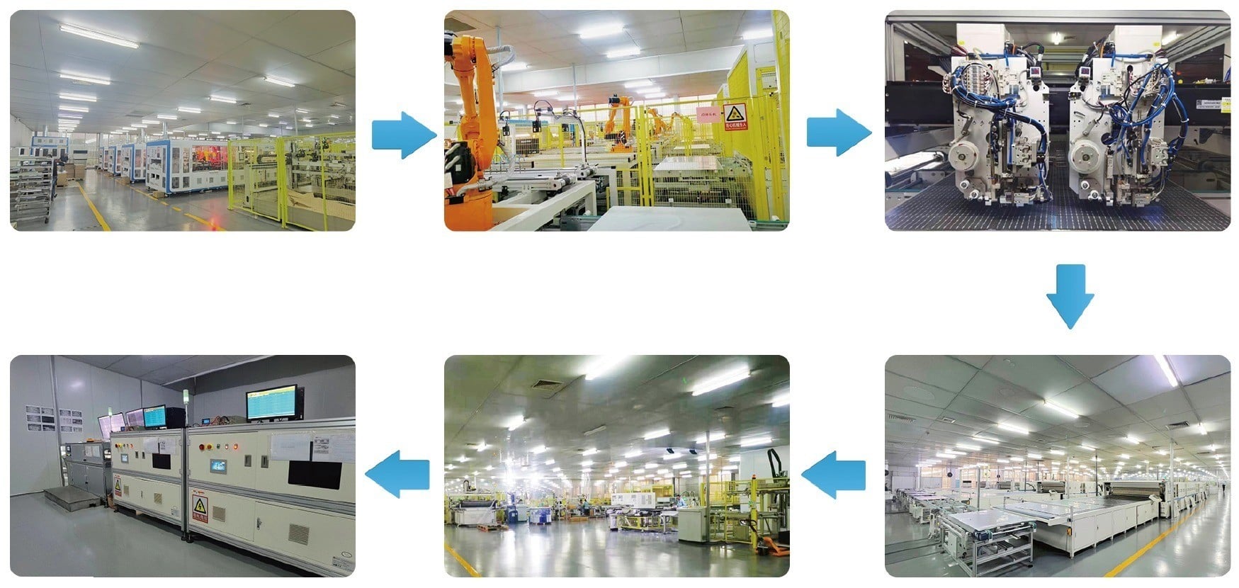公司拥有多条新型智能化生产线,能实现激光无损切片、毫米级定位焊接、机械化排版、智能设备检测等全自动生产。产品经过多道EL测试、外观检测、组件性能测试、安规测试、FQC组件检查、OQC成品检查等多道流程控制产品质量。