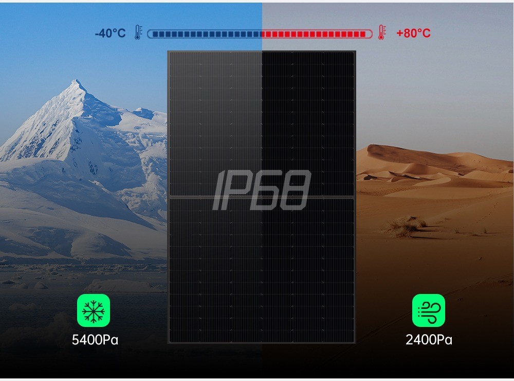 From the hot desert to snowy landscapes,our solar panels are designed for use in a wide range of environments. With a maximum load capacity of 5400Pa for snow and 2400Pa for wind, your investment is safely protected. They work flawlessly between -40°C and 85°C, providing constant power generation, ideal for balcony installation in various geographical regions.