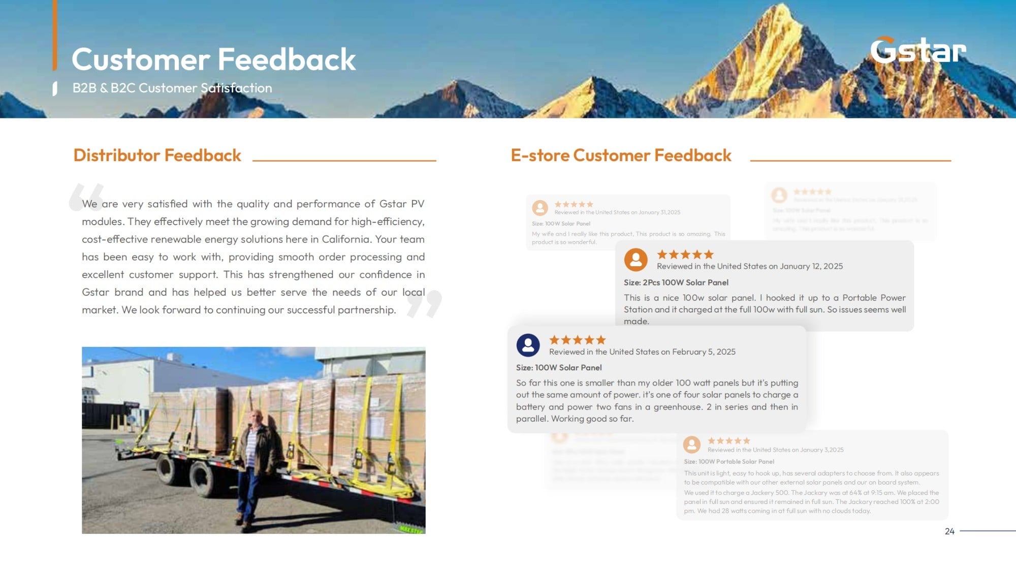 Gstar Solar is a cutting-edge high-tech enterprise that operates across the entire value chain of the solar panel industry, from producing silicon ingots and wafers to manufacturing solar cells, frames, and modules. Our expertise spans research, production, sales, and engineering technical services. Since our inception, we have adhered to a steadfast commitment to pursuing excellent quality and building a reliable brand in the photovoltaic (PV) industry. Our products undergo rigorous inspections by authoritative bodies and have garnered international recognition from entities such as ETL, TUV, and the California CEC.