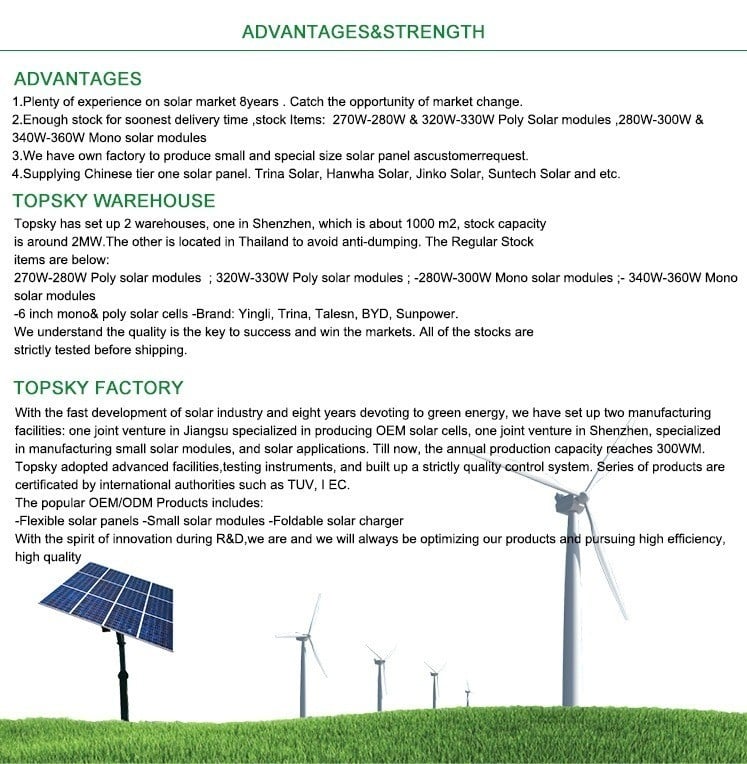 Involved in researching, producing, and popularizing solar cells, modules, and application products, Topsky offers safe, reliable, and efficient solar system installation and integrated solutions worldwide. With 3 sole-funded companies in Shenzhen and 2 manufacturing factories in Jiangsu and Ningbo, Topsky distributes its solar products globally. Operating manufacturing facilities in Zhejiang and Jiangsu provinces and conducting global sales and marketing in Shenzhen and Hong Kong, China, Topsky can supply customers with 200MW OEM solar cells, 800MW solar modules, and 60,000 sets of solar application products annually.