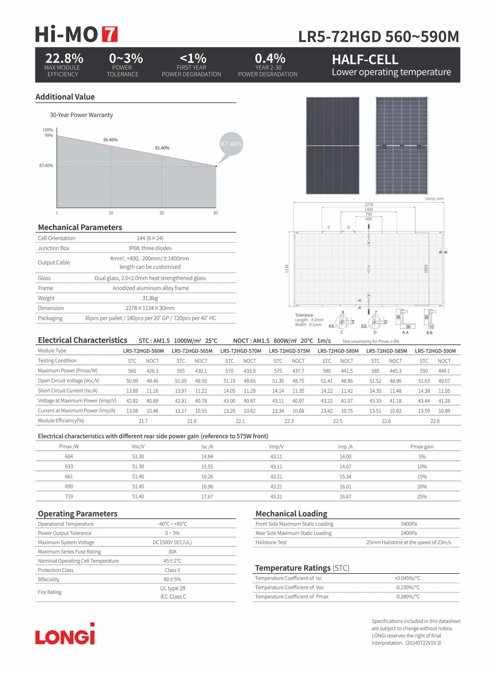The robust double-glass structure, high mechanical load capacity (5400Pa front / 2400Pa rear), and IP68-rated junction box enhance durability in harsh environments. Backed by a 12-year product warranty and an industry-leading 30-year linear power output warranty, the LR8-66HGD 620W is a reliable choice for projects seeking long-term value and maximum returns.