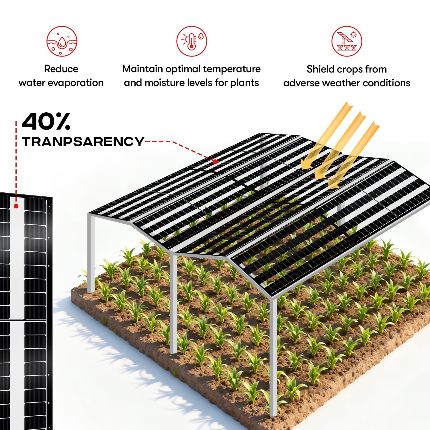 Delivering up to 21.96% efficiency and 580W power output, Terra is ideal for agrivoltaics, PV noise barriers, solar fencing, and large-scale residential projects. Its robust design and high performance make it a reliable choice for diverse climates and applications. Terra Series exemplifies AESOLAR’s commitment to innovation, offering a future-proof solution for renewable energy and agricultural productivity.