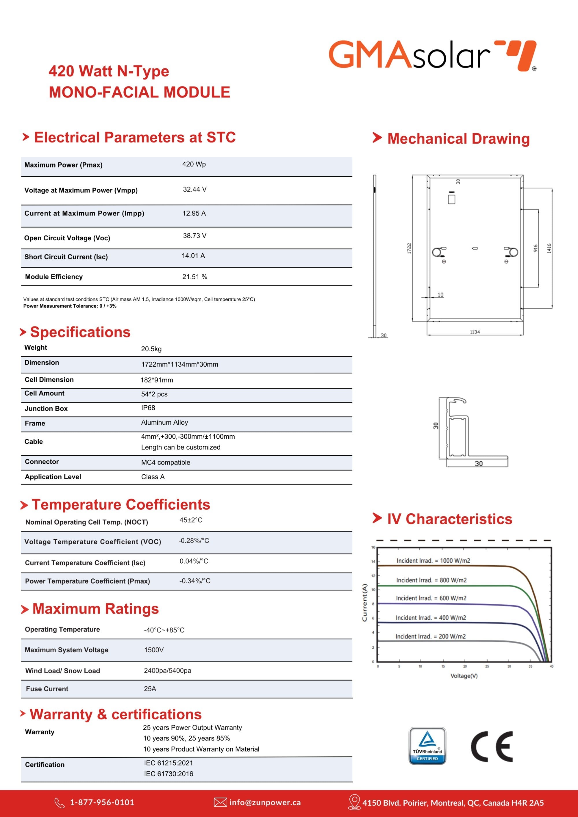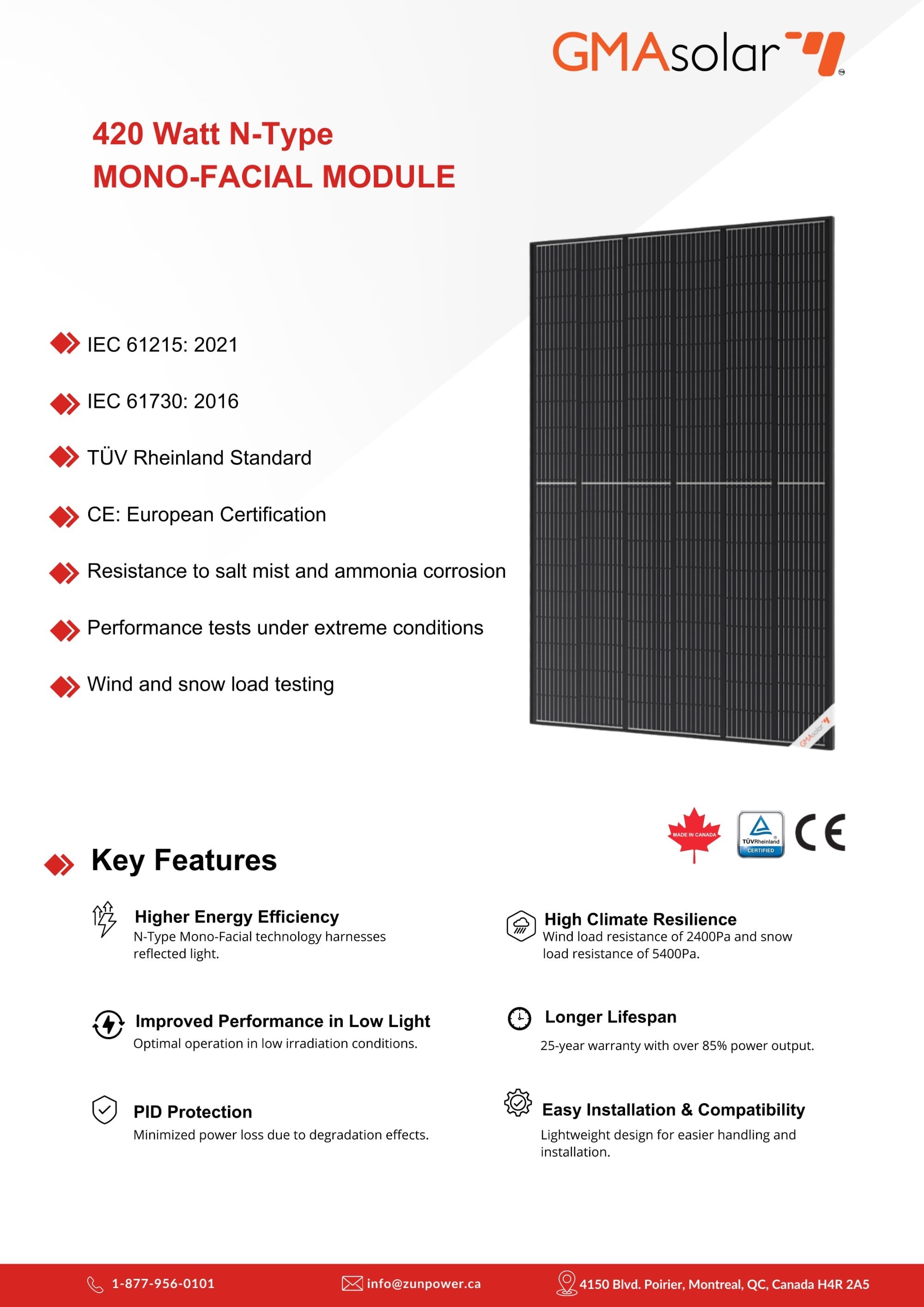 With a strong focus on manufacturing excellence, Zun Power produces panels ranging from 10W to 700W, using advanced technologies like PERC, TOPCon, and bifacial. All products are designed for durability and performance, built to withstand Canada’s harshest climates, and certified to meet international standards, including CSA (Canada/USA), CSA HazLoc, and TUV Rheinland.