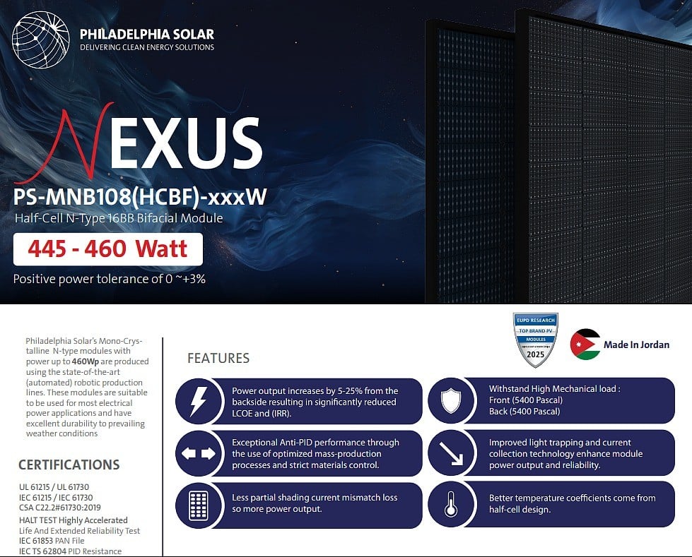 Established in 2007, Philadelphia Solar is a Tier-1 solar panel manufacturer and the largest manufacturer of solar panels and steel mounting structures in the Middle East, Europe, and Africa (MEA), with a current production capacity of 580 MW/year. It was the first MENA region company to manufacture, develop, design, construct, own, and operate utility-scale commercial and industrial photovoltaic plants. With Free Trade Agreements between Jordan, the EU, the U.S., Canada, Morocco, and throughout the MENA region, Philadelphia Solar exports PV modules to over 52 countries through more than 220 distributors worldwide and has 3 regional offices in the US, Iraq, and Morocco.