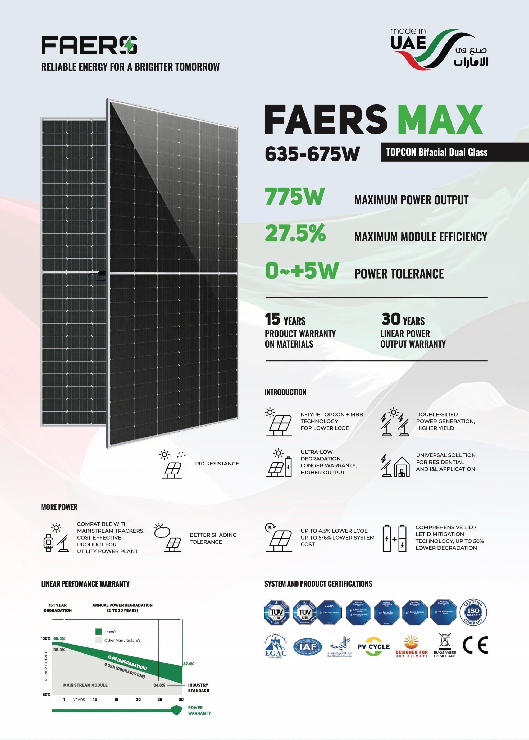 In 2023, ZAKH transitioned to full-scale manufacturing, establishing a state-of-the-art production facility in the RAKEZ Free Zone, UAE. Today, the company operates two independent production lines: a 600 MW solar panel line and a BIPV façade line with an annual capacity of approximately 500,000 m². ZAKH’s products are engineered for hot, arid climates, offering high thermal resistance, sand durability, and long-term performance.