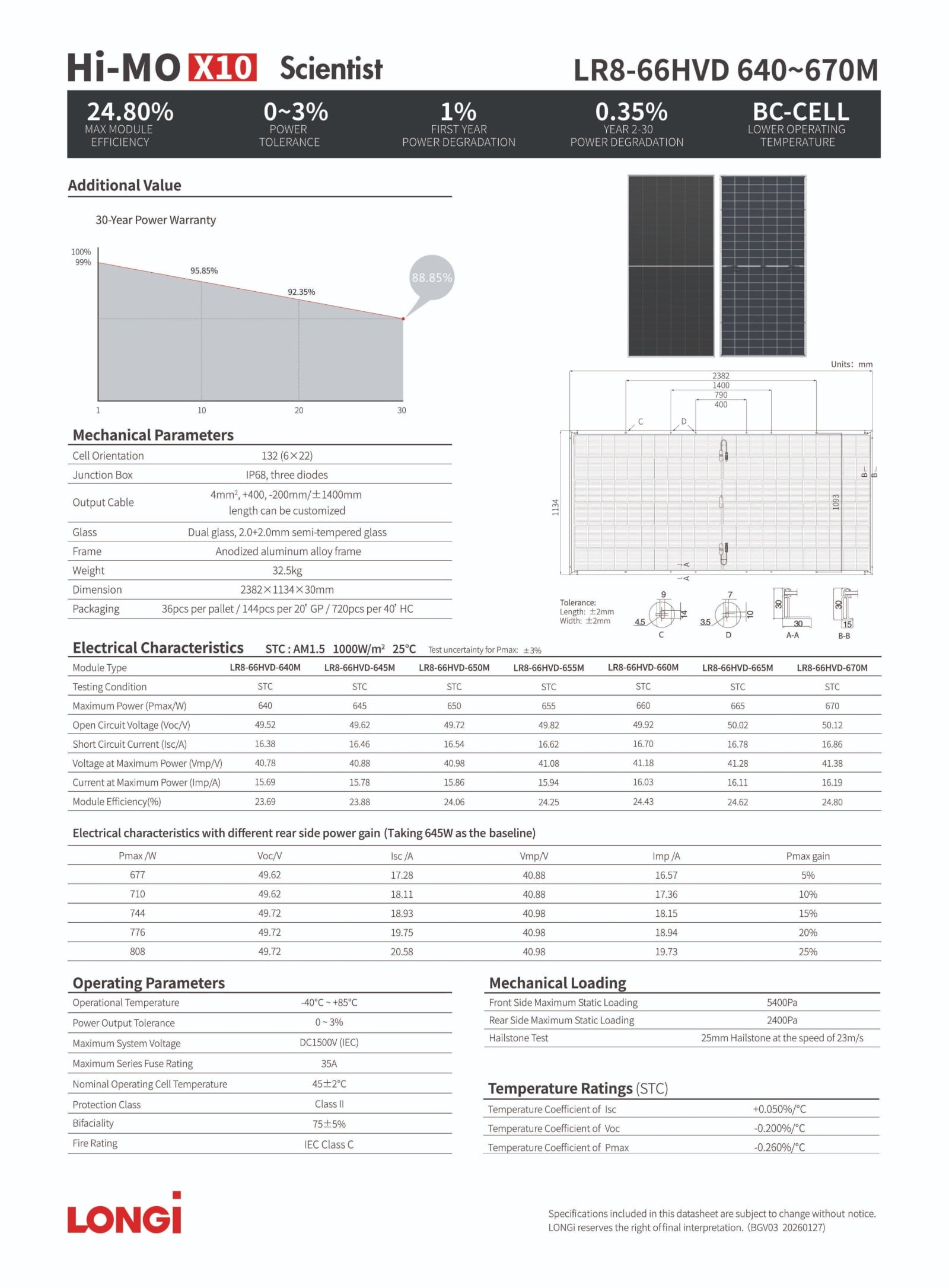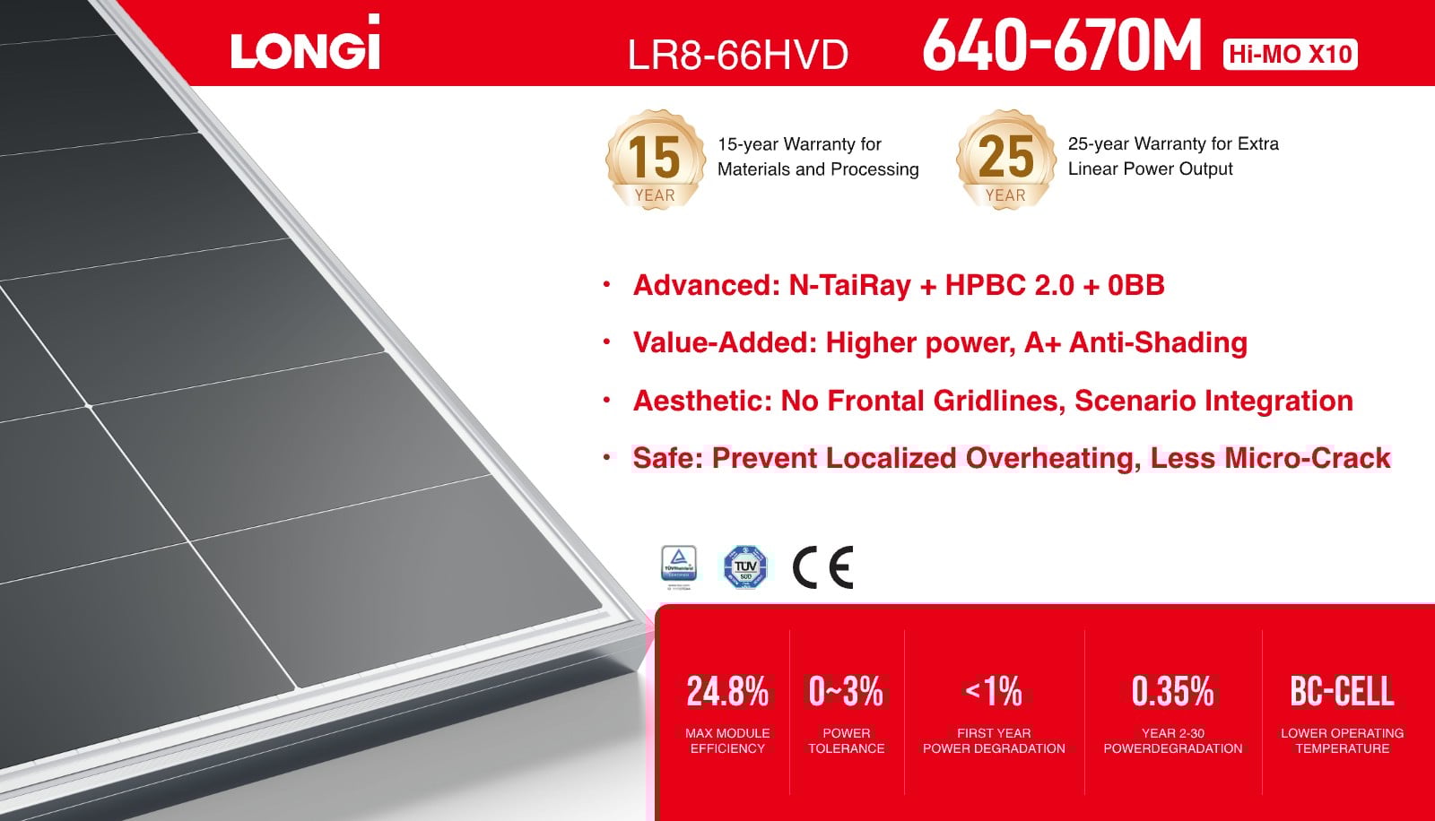 Built with advanced TaiRay wafer and BC cell technology, the LONGi Hi-MO X10 module delivers exceptional efficiency, reliability, and power generation performance for modern solar installations. With a power output of up to 665W and maximum module efficiency reaching 24.6%, it provides outstanding energy yield and improved project returns.
